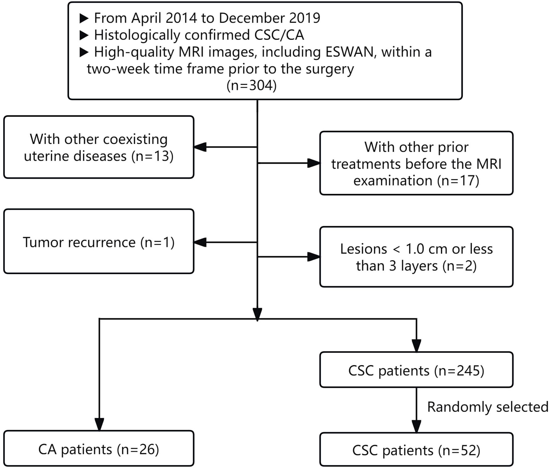 Flowchart detailing patient selection from April 2014 to December 2019 for a study on histologically confirmed CSC/CA with high-quality MRI images. Starting with 304 participants, the chart excludes those with coexisting uterine diseases (13), prior treatments (17), lesions less than one centimeter or less than three layers (2), and tumor recurrence (1). The final groups are 26 CA patients and 245 CSC patients, with 52 CSC patients being randomly selected.