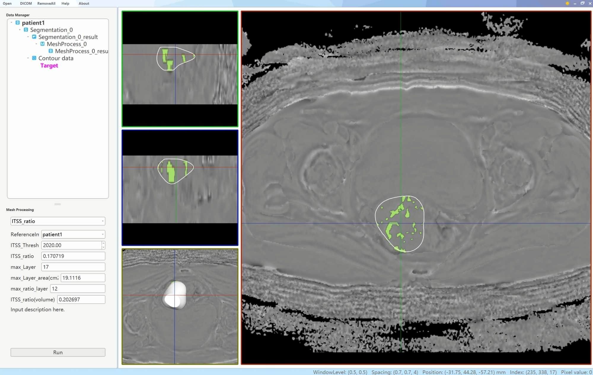Figure 2. A schematic diagram of the AS software was utilized to calculate the tumor ITSS ratio. By employing the interpolation and labeling tools within the AS software, the ITSS ratio within the ROI was determined. The ITSS ratio is operationally defined as the ratio of pixels exhibiting low signal intensity within the ROI to the total number of pixels present within the ROI.