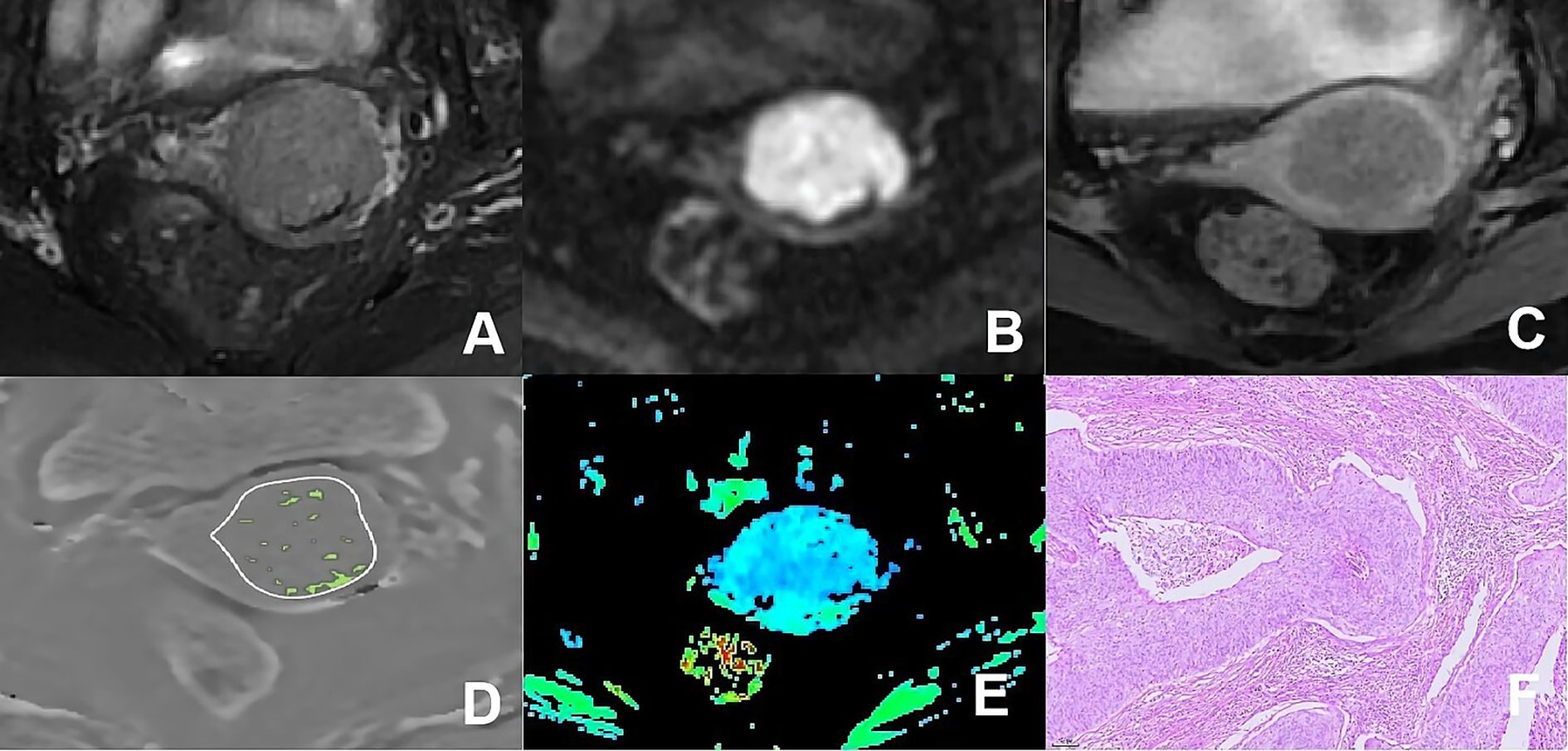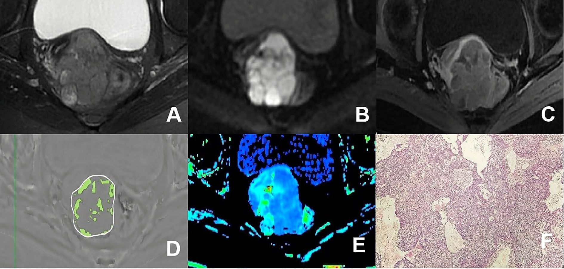 MRI and pathology images of a pelvic structure. A: T2-weighted MRI showing detailed anatomy. B: Diffusion-weighted MRI highlighting a bright area. C: Post-contrast MRI indicating enhancement. D: ADC map showing precise tumor margins with green highlights. E: Color-coded map displaying intensity variations, with blue and green areas. F: Histological slide showing cellular arrangement and tissue pattern.