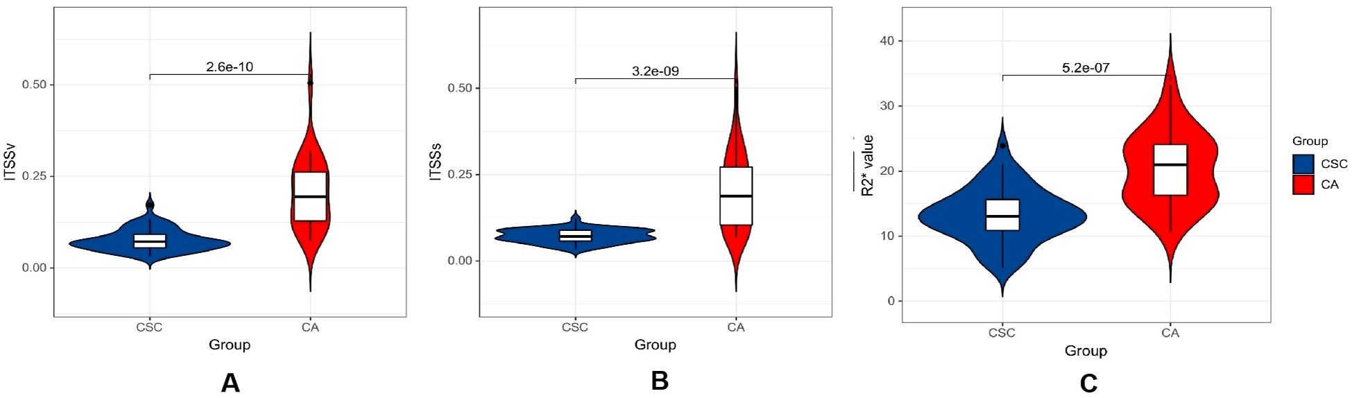 Three violin plots compare groups CSC (blue) and CA (red) across different metrics. Plot A shows ITSSv with a significant difference (p=2.6e-10). Plot B shows ITSSs with a significant difference (p=3.2e-09). Plot C displays R2* value with a significant difference (p=5.2e-07). Each plot highlights distribution and central tendency differences between the groups.