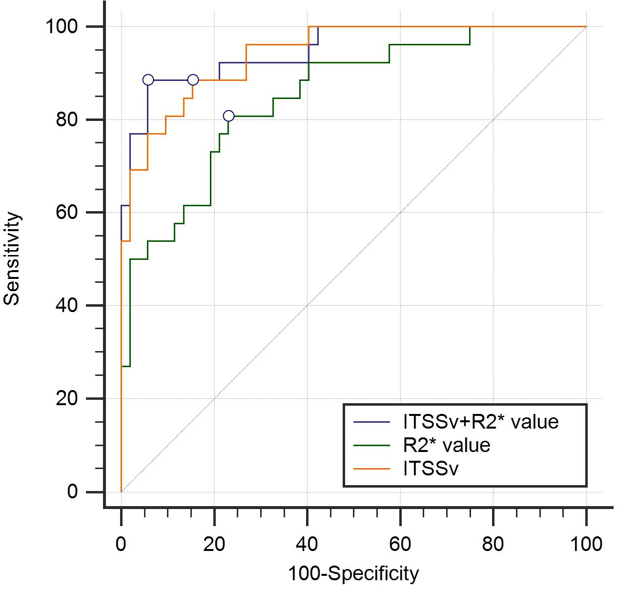 ROC curve comparing three models: ITSSv, R2* value, and ITSSv+R2* value, plotted with sensitivity on the y-axis and one hundred minus specificity on the x-axis. ITSSv+R2* value shows the best performance with the highest area under the curve, followed by ITSSv and R2* value. The plot includes a diagonal reference line and a legend.