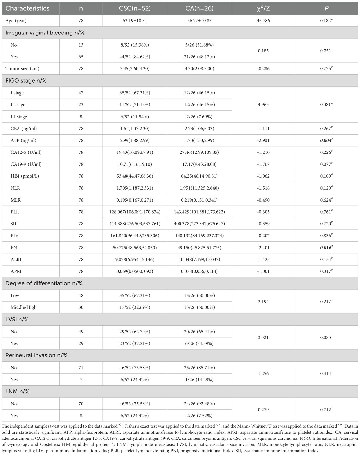 According to the above criteria, 271 patients were enrolled, comprising 26 CA patients and 245 CSC patients. For the subsequent statistical analysis, 26 CA patients and 52 controls with CSC in a 1:2 ratio (randomly selected from 245 CSC patients) were ultimately included in our study (20). The flowchart of patient selection process was illustrated in Figure 1. The demographic and clinicopathological characteristics of the two groups were gathered from the hospital information system, including variables such as age, irregular vaginal bleeding, tumor size, FIGO stage, carcinoembryonic antigen, AFP, carbohydrate antigen 12-5, carbohydrate antigen 19-9, epididymal protein 4, neutrophil-lymphocyte ratio, monocyte-lymphocyte ratio, platelet-lymphocyte ratio, systematic immune inflammation index, pan-immune inflammation value, PNI, aspartate aminotransferase to lymphocyte ratio index, aspartate aminotransferase to platelet ratio index, degree of differentiation, lymphatic vascular space invasion, perineural invasion, and lymph node metastasis.