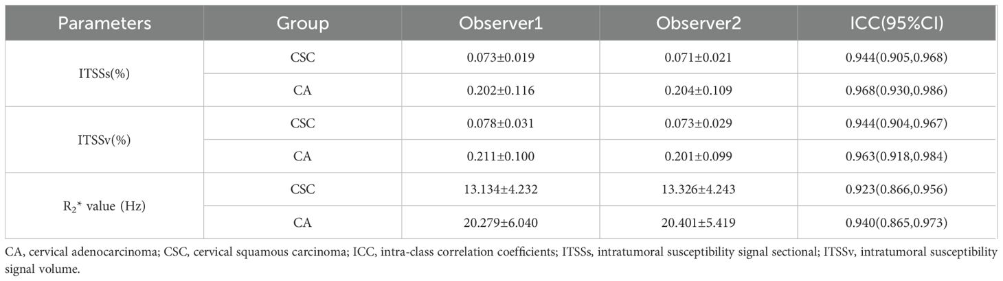 Citation: Chen A, Meng X, Ma C, Tian S, Song Q, Liu A, Zhuang M and Wang H (2025) Automated ITSS extraction combined with R2* values obtained from enhanced T2*-weighted angiography in magnetic resonance imaging: a promising approach for differentiate cervical adenocarcinoma from squamous carcinoma. Front. Oncol. 15:1578525. doi: 10.3389/fonc.2025.1578525