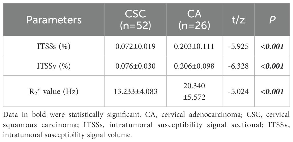 In this study, we demonstrated the potential utility of ITSS in differentiating between CA and CSC. ITSS provides a comprehensive depiction of neovascularization and microhemorrhage within tumors, serving as a noninvasive and intuitive imaging marker for vascular proliferation. Our findings indicated that ITSSs and ITSSv were significantly higher in the CA group compared to the CSC group. This observation can be attributed to the more malignant and aggressive nature of CA, which expresses markedly higher levels of vascular endothelial growth factor-A than CSC (38). This over expression leads to neovascularization characterized by thin walls, high vascular permeability, and frequent microhemorrhages, thereby contributing to the elevated ITSSs and ITSSv. Furthermore, ITSS ratios offer the advantage of automated quantification, simplifying implementation and minimizing subjective bias when compared to other quantitative parameters, such as R2*, derived from ESWAN.