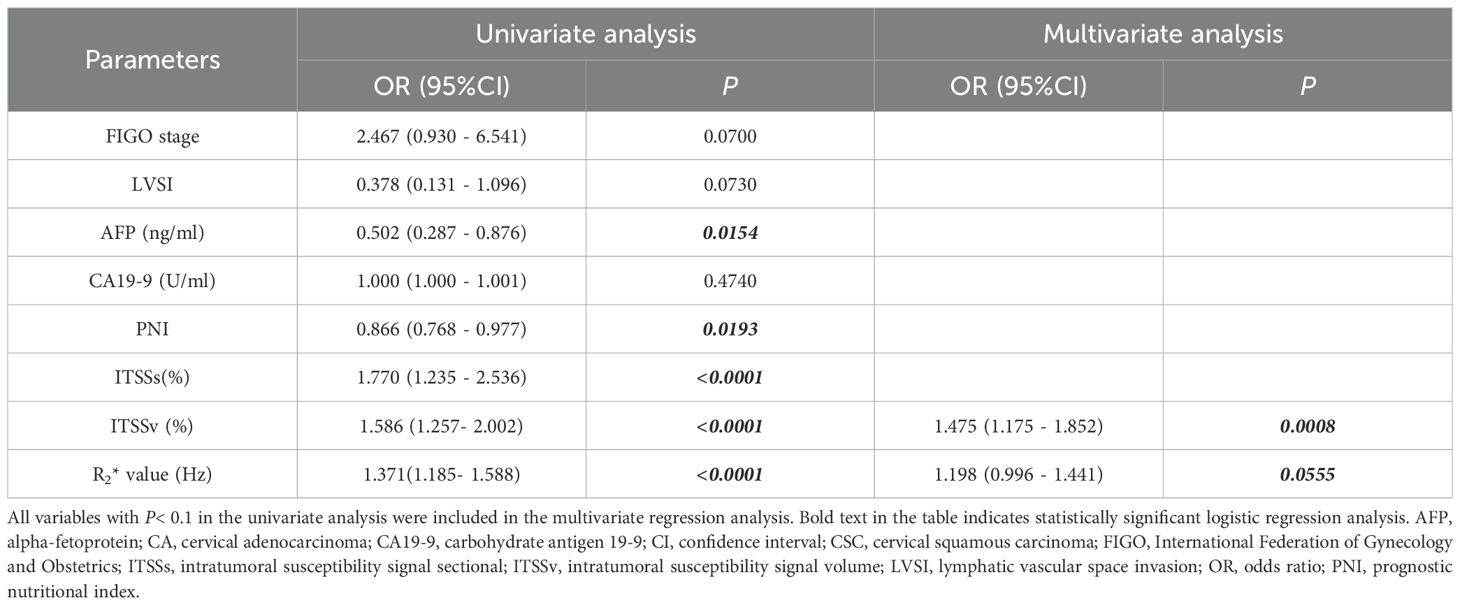 The comprehensive clinicopathological data and various quantitative MRI parameters with P values below 0.1 between the two groups were incorporated into the subsequent analysis. Following univariate and multivariate logistic regression analyses, the ITSSv and R2* value emerged as independent predictors for differentiating between CA and CSC, as illustrated in Table 5.