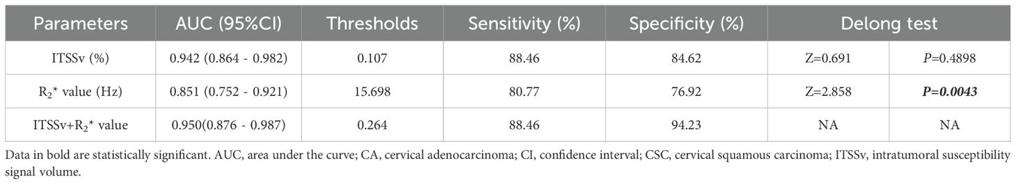Currently, the R2* value has been preliminarily applied in the context of diseases affecting the female pelvic system (15, 44). However, its application in CC is limited and warrants further exploration. Li et al. (45) investigated the R2* value as a predictor of prognosis in advanced CSC treated with concurrent chemoradiotherapy. Additionally, research by Li-Ou Z et al. (43) confirmed a moderate correlation between activated hypoxia inducible factor-1α expression and the R2* value in CC. Our study found that R2* values were significantly higher in the CA group compared to the CSC group. CA is characterized by relatively aggressive tumor behavior (46), with tumor cells exhibiting rapid proliferation and metabolism. This results in an increased uptake of nutrients, including sugars and proteins, along with heightened oxygen consumption (47). Hypoxia prompts tumor cells to release various angiogenic factors, stimulating the formation of immature neovascularization, which further reduces oxygen saturation. Consequently, the increase in deoxygenated hemoglobin leads to elevated R2* values, resulting in higher R2* values in the CA group compared to the CSC group.