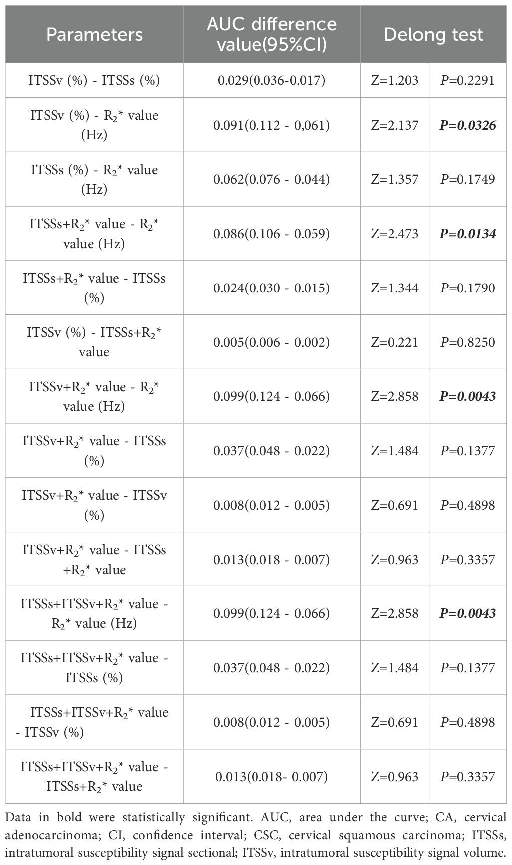 Pairwise comparisons of the single parameters ITSSs, ITSSv, R2* value, and the combined models were compared pairwise. The Delong test revealed that the AUCs for ITSSv compared to R2* value, ITSSs + R2* value compared to R2* value, ITSSv + R2* value compared to R2* value, and ITSSs + ITSSv + R2* value compared to R2* value between the two groups were statistically significant (P< 0.05), as presented in Table 7.