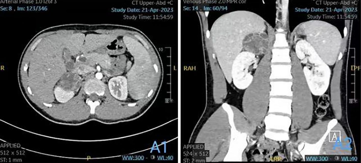 Preoperative computed tomography angiography and urography (CTA+CTU) revealed a well-circumscribed, low-density mass (approximately 5.7×5.1×4.5 cm) in the right adrenal gland. The solid components showed enhancement on contrast administration (Figures 1A1, A2). The enhancement pattern was heterogeneous, with areas of avid contrast uptake in the arterial phase and washout in the delayed phase, features that can be associated with both hypervascular tumors like pheochromocytoma and certain soft tissue sarcomas. The liver, gallbladder, spleen, pancreas, and kidneys appeared normal in size, shape, and attenuation, with no abnormal enhancement. The abdominal bowel was normally distributed without dilation or effusion. No definite masses, enlarged lymph nodes (hepatic hilum or para-aortic), or peritoneal effusion were observed. The initial differential diagnosis included a left adrenal solid-cystic mass, with considerations of pheochromocytoma or ganglioneuroma.