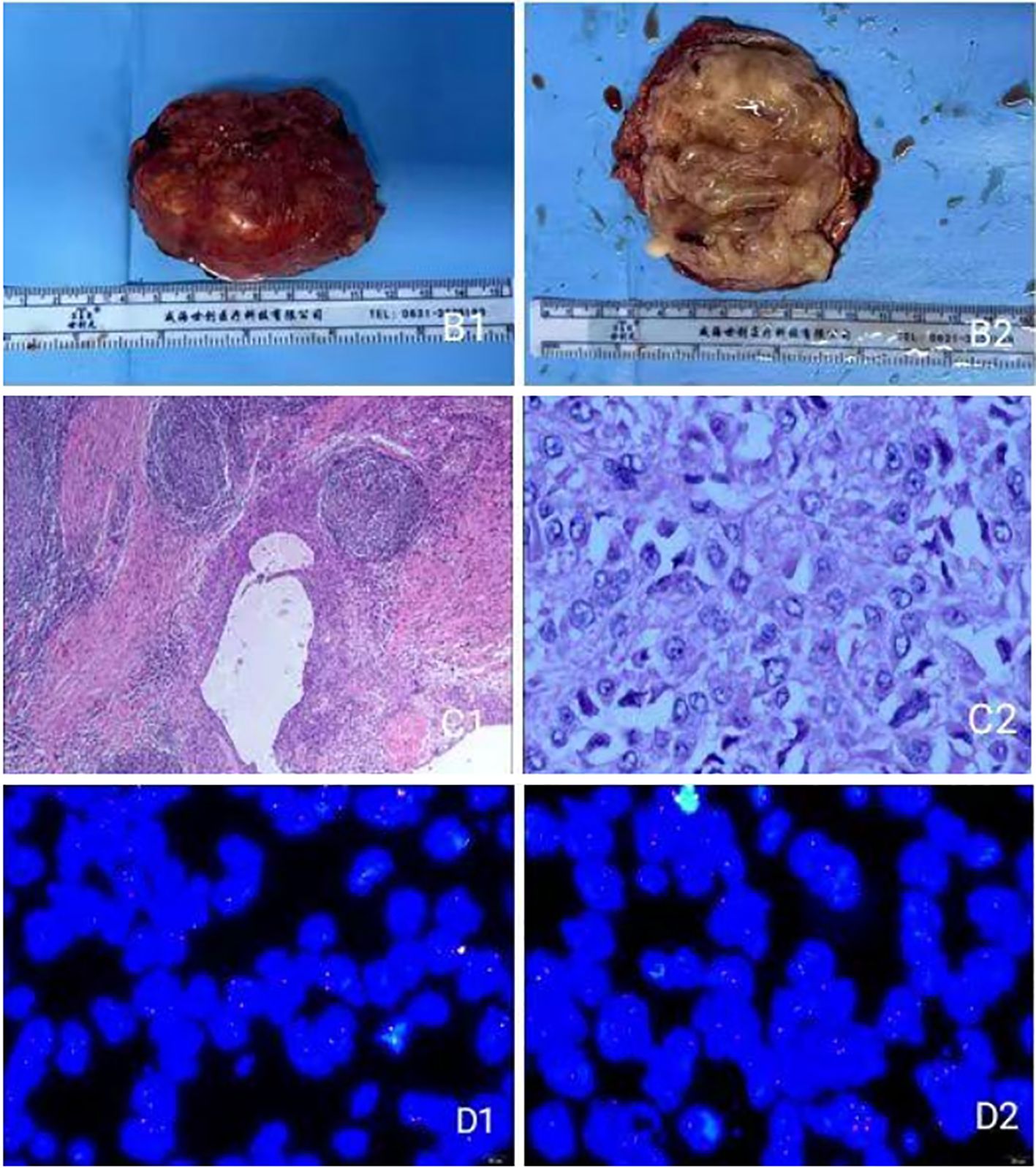 Figure 2. (B1) Gross view of the tumor; (B2) Cross-sectional view of the tumor; (C1, C2) under light microscope; (D1, D2) FISH assay display.