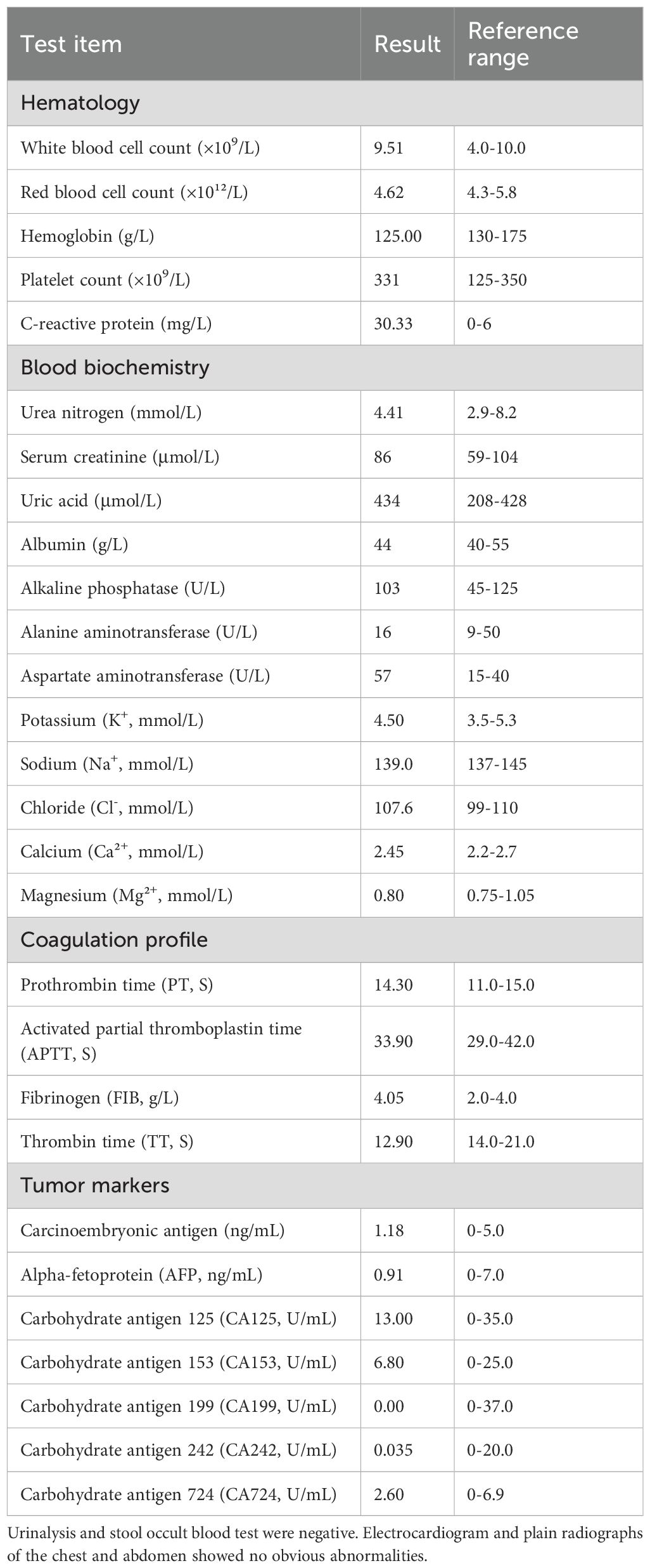 Routine laboratory parameters were within normal limits. Detailed results of hematological, biochemical, coagulation, and tumor marker tests are summarized in Table 1.