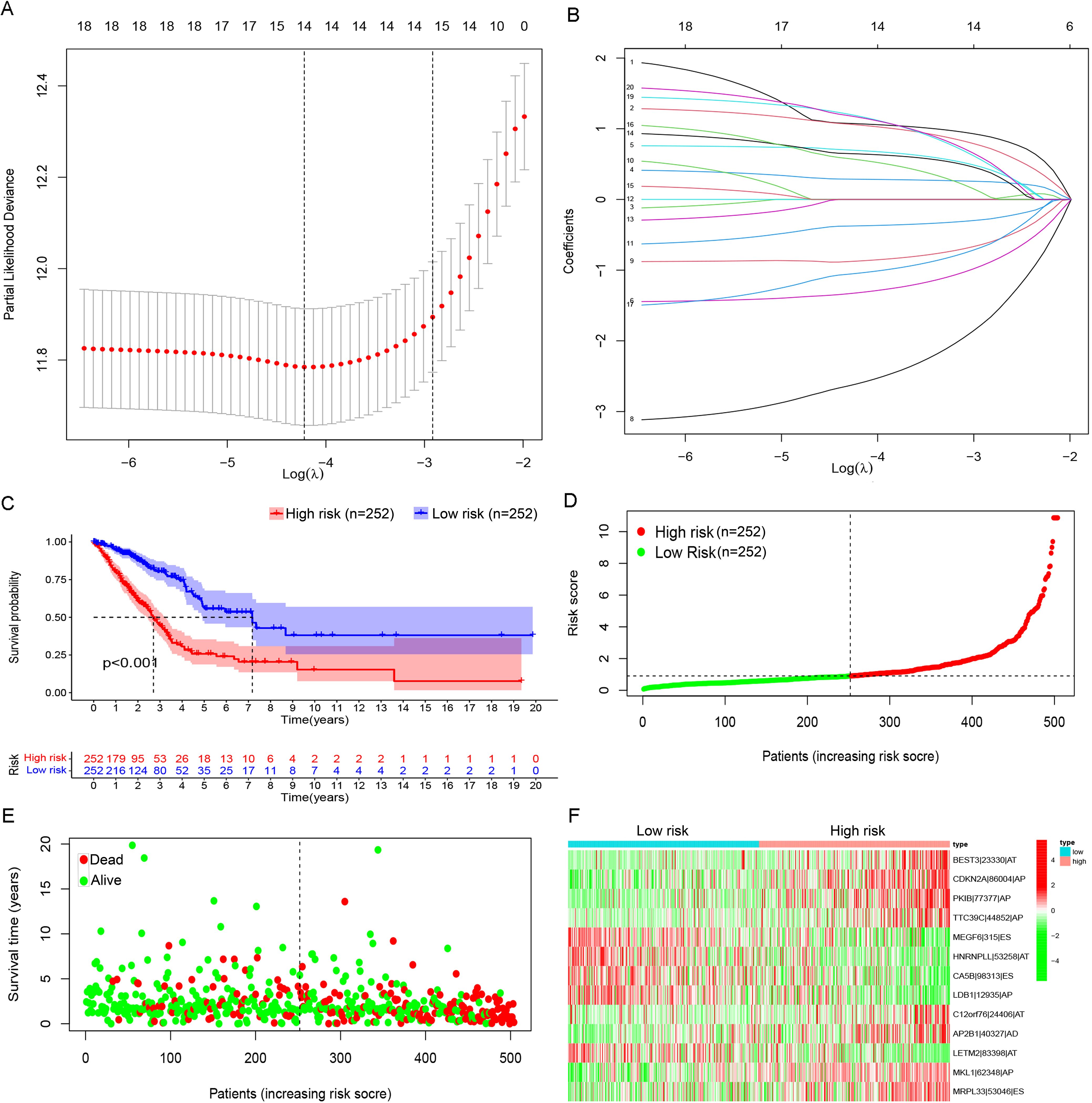 Figure 2. Prognostic model based on PASEs. (A) The Lambda value distribution plot of the 14 candidate PASEs demonstrated a bell-shaped curve with a central peak and symmetrical bilateral tapering, resembling a normal distribution. This pattern suggests a stable data generation process operating within expected variability limits. (B) The coefficient of PASEs were derived through LASSO regression analysis. (C) The Kaplan–Meier survival curves were stratified by risk groups (high vs. low) on the basis of the prognostic model, demonstrating significant divergence in clinical outcomes (log-rank P< 0.001). (D) Scatter plots illustrate the distribution of low-to-high risk values among LUAD patients. (E) Scatter plot displaying survival time and status in LUAD patients. (F) A heatmap shows the PSI of PASE in the LUAD prognostic model.