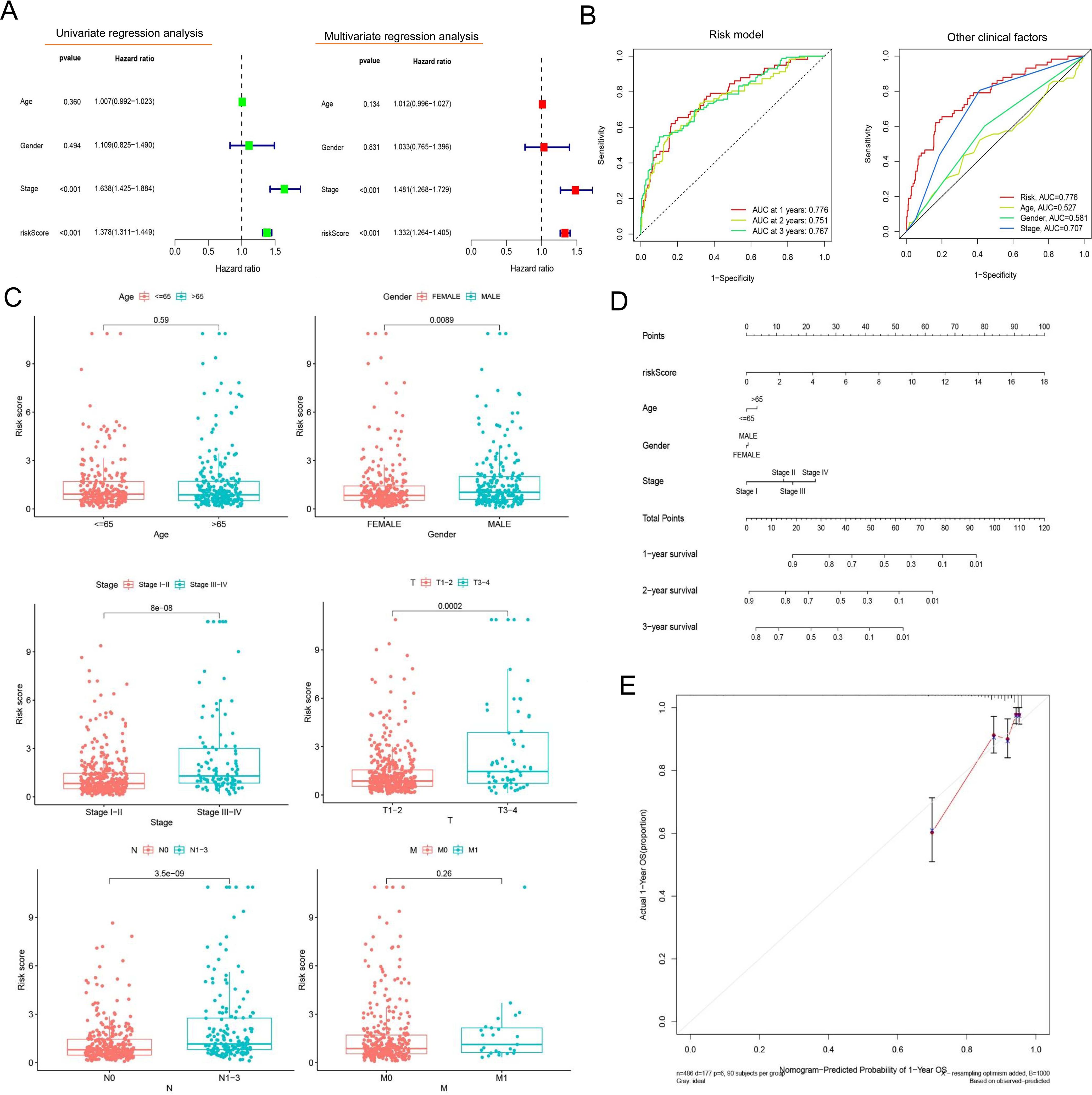 Figure 3. Evaluation of the prognostic risk model’s value. (A) Forest plots presenting the results of univariate and multivariate Cox regression analysis. The forest plots illustrate hazard ratios (HRs) with 95% confidence intervals (CIs) for each variable assessed in the prognostic model. (B) ROC curves comparing the prognostic model and other clinical factors. The area-under-the-ROC-curve (AUC) values quantify predictive accuracy, with the risk model outperforming traditional clinical factors at 1-, 3-, and 5-year survival intervals. (C) Comparative analysis of clinical characteristics between the high- and low-risk groups. Boxplots illustrate the distribution of age, whereas stacked bar charts depict categorical variables (gender, tumor stage, and TNM [tumor, node, metastasis] classification) stratified by the prognostic risk model’s stratification (high- vs. low-risk groups). (D) A line graph depicting survival probability over time. (E) The calibration curve. This plot assesses agreement between predicted and observed survival rates at a defined timepoint. Ideal calibration (45° dashed line) is compared to our model’s predictions (solid line), with minor deviations indicating high reliability.