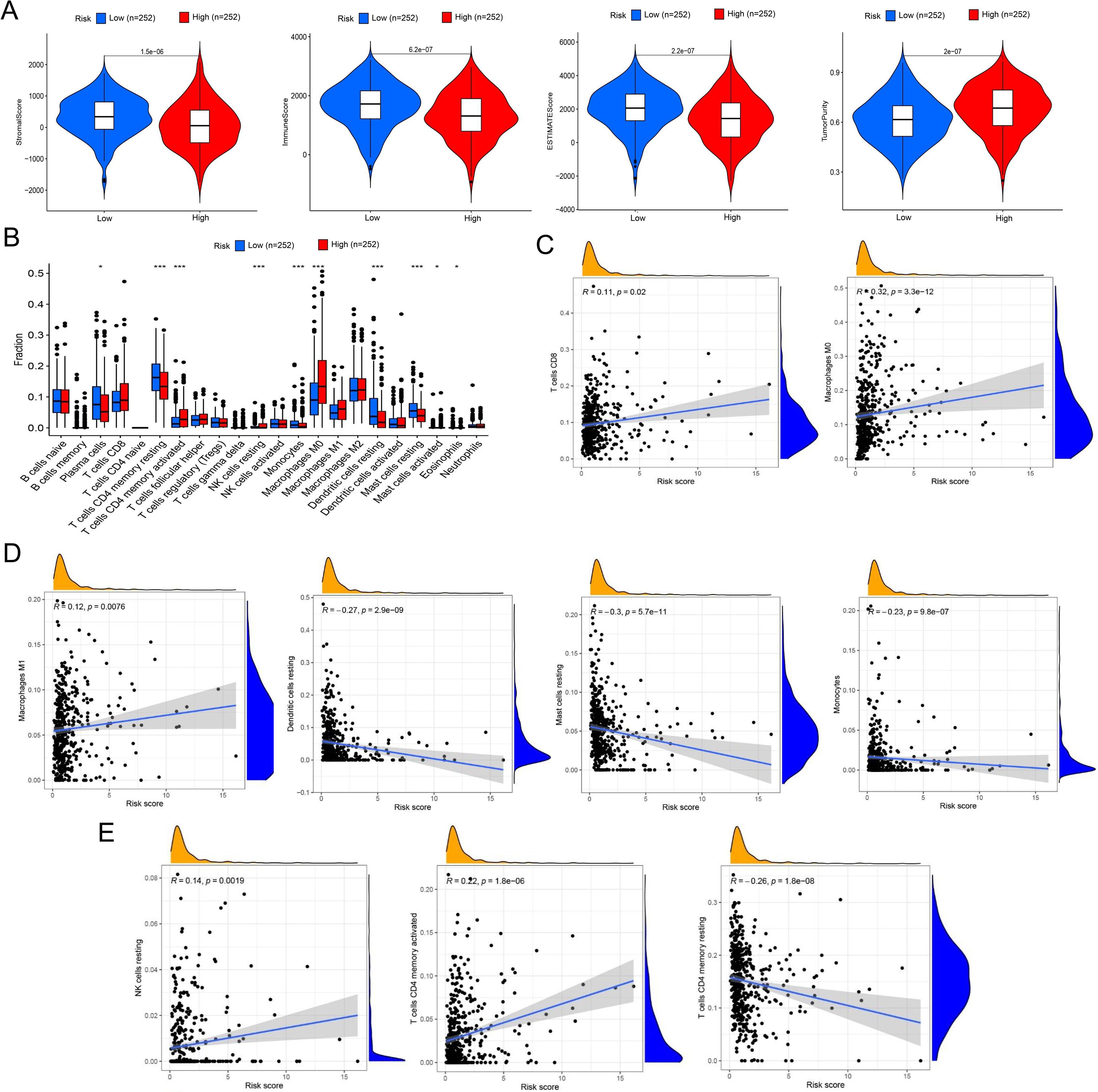 Figure 4. Comprehensive characterization of tumor microenvironment and immune cell infiltration stratified by risk groups in LUAD. (A) Violin plots quantitatively compare stromal score (reflecting extracellular matrix components), immune score (representing overall immune cell infiltration), tumor purity (estimated proportion of malignant cells), and ESTIMATE score (combined microenvironment evaluation) between high- and low-risk LUAD patients. (B) Boxplots with notches (representing 95% confidence intervals of the median) demonstrate statistically significant variations in 22 immune cell subtypes quantified by CIBERSORTx deconvolution algorithm between risk groups. (C) Scatter plots with locally weighted smoothing (LOESS) regression illustrate the non-linear associations between continuous risk scores and immune cell infiltration, revealing a positive correlation with CD8+ cytotoxic T cell abundance and a positive relationship with M0 macrophage infiltration. (D, E) Systematic immune correlation profiling. Expanded correlation matrices highlight risk-associated immune features. *P< 0.05 and *** P< 0.001.