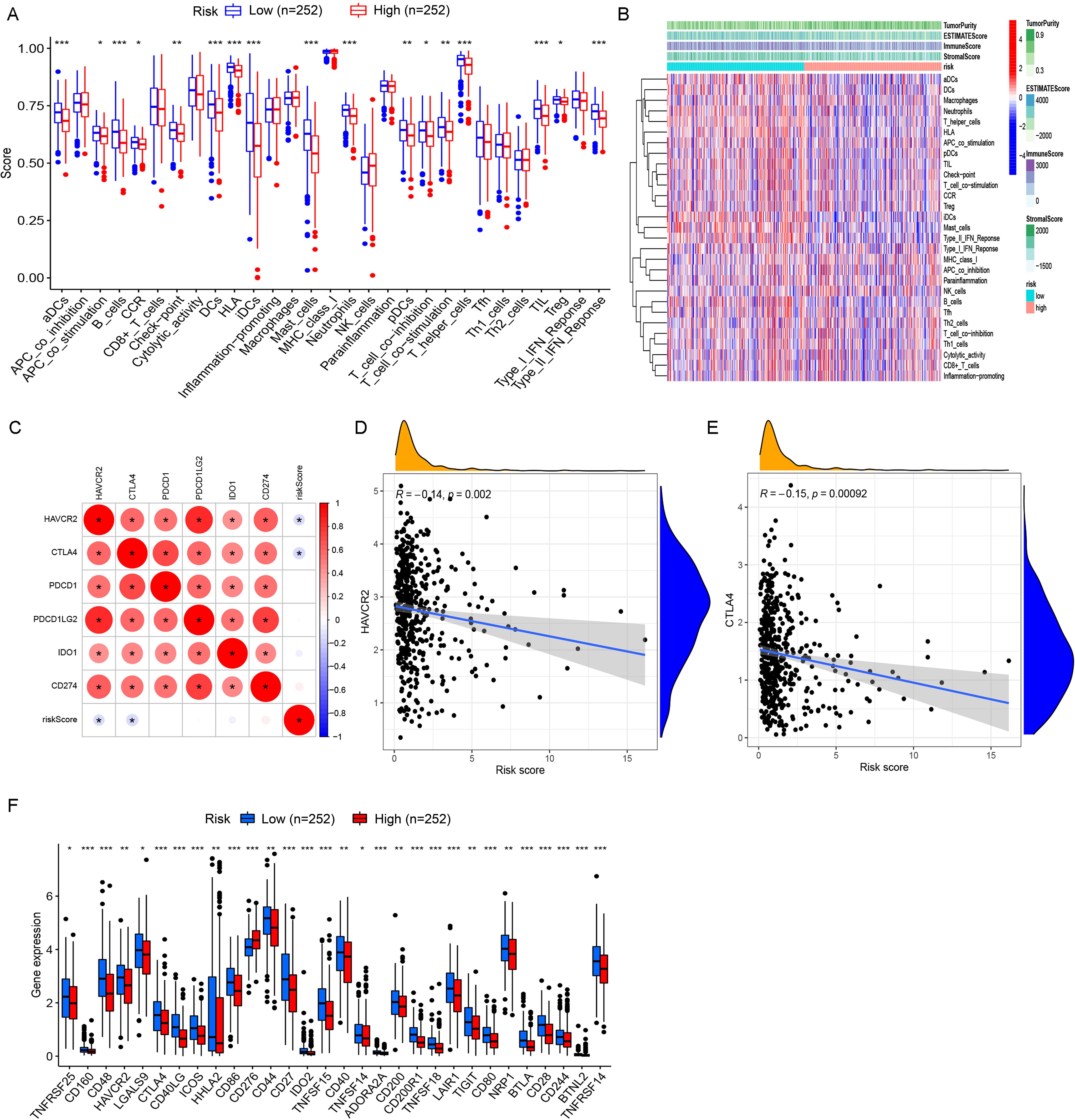 Figure 5. Comprehensive immune profiling and checkpoint expression patterns in LUAD risk groups. (A) Boxplots with overlaid individual data points compare the abundance of tumor-infiltrating immune cells and immune functional scores between high- and low-risk LUAD patients. (B) Multi-dimensional immune landscape characterization. The heatmap demonstrates systematic variations in immune signatures across risk groups. Columns represent patients (stratified by risk), whereas rows show immune features. (C) Spearman correlation matrix identifies clinically relevant immune checkpoints significantly associated with risk scores. Circle size represents correlation strength, while color indicates direction (red, positive; and blue, negative). (D, E) Key checkpoint expression dynamics. LOESS regression plots depict non-linear relationships between: (D) HAVCR2 expression and risk scores, with marginal histogram showing risk score distribution; (E) CTLA4 expression and risk scores. Both checkpoints show monotonic increases with risk progression. (F) Comparative boxplots confirm elevated expression of one clinically targetable checkpoints (CD276) in high-risk patients. *P< 0.05, **P< 0.01, and *** P< 0.001.