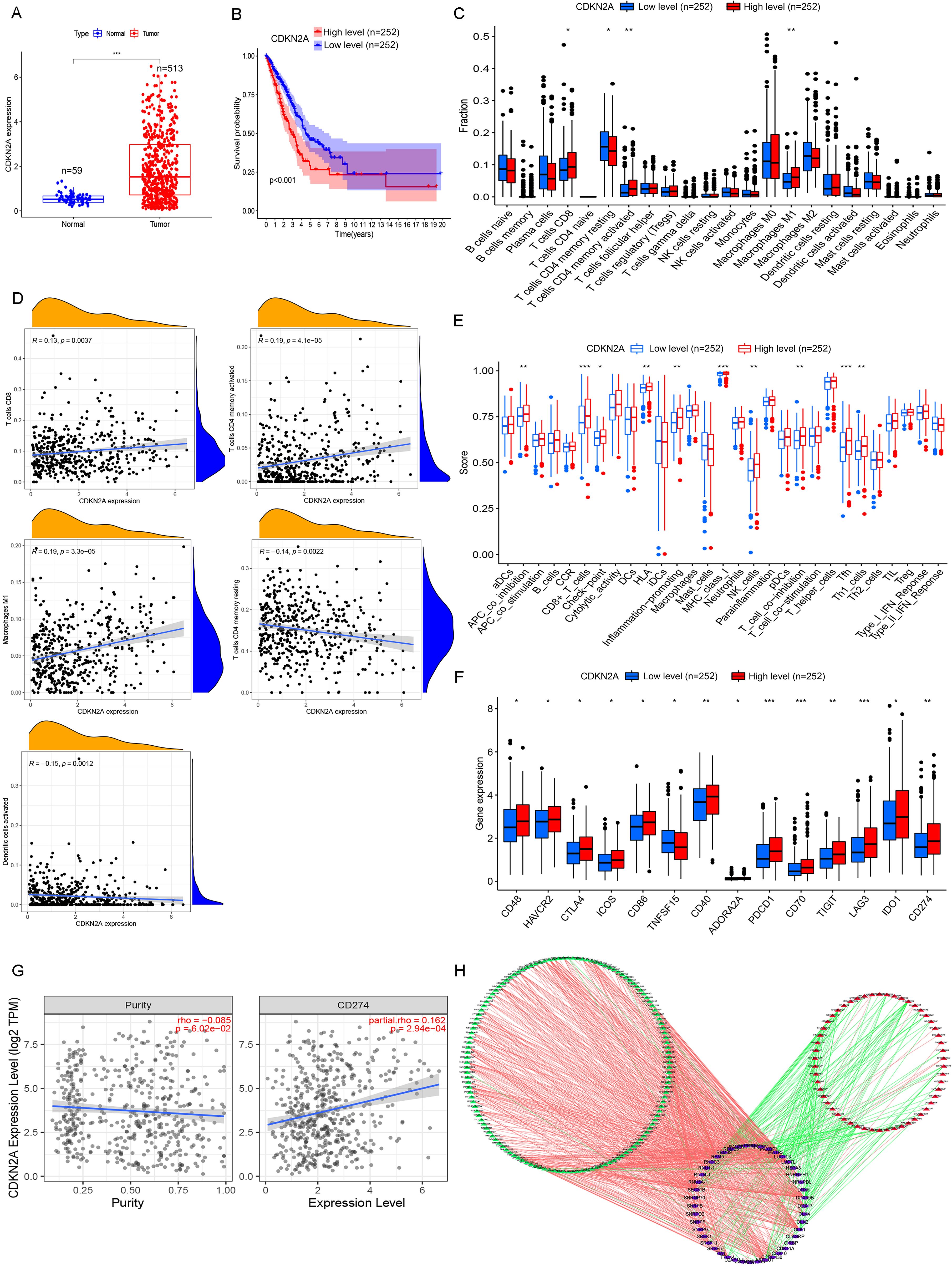 Figure 6. Comprehensive analysis of CDKN2A in high- and low-risk LUAD patients. (A) Differentially expressed genes (DEGs) between high- and low-risk LUAD groups reveal key transcriptional alterations linked to CDKN2A status. (B) Kaplan–Meier survival analysis demonstrates distinct clinical outcomes between tumor tissues and adjacent normal tissues when stratified by CDKN2A expression levels. (C) Comparative analysis of immune cell infiltration patterns shows significantly different immune microenvironment compositions between CDKN2A high- and low-expression groups. (D) Correlation analysis elucidates the quantitative relationship between CDKN2A expression levels and immune cell abundance in the tumor microenvironment. (E) Comprehensive evaluation of immune cell subpopulations and functional activity scores demonstrates CDKN2A-dependent immunomodulatory effects. (F) Systematic comparison of immune checkpoint molecule expression (PD-1, CTLA-4, etc.) reveals differential immune evasion potential between CDKN2A expression groups. (G) Scatter plot analysis identifies a significant correlation between CDKN2A expression and CD274 (PD-L1) levels, suggesting potential implications for immunotherapy response. (H) The SF-AS regulatory network analysis identifies 188 prognosis-associated splicing events (54 high-risk and 134 low-risk) coordinated by 45 splicing factors, providing mechanistic insights into CDKN2A-mediated LUAD pathogenesis through alternative splicing regulation. *P< 0.05, **P< 0.01, and ***P< 0.001.