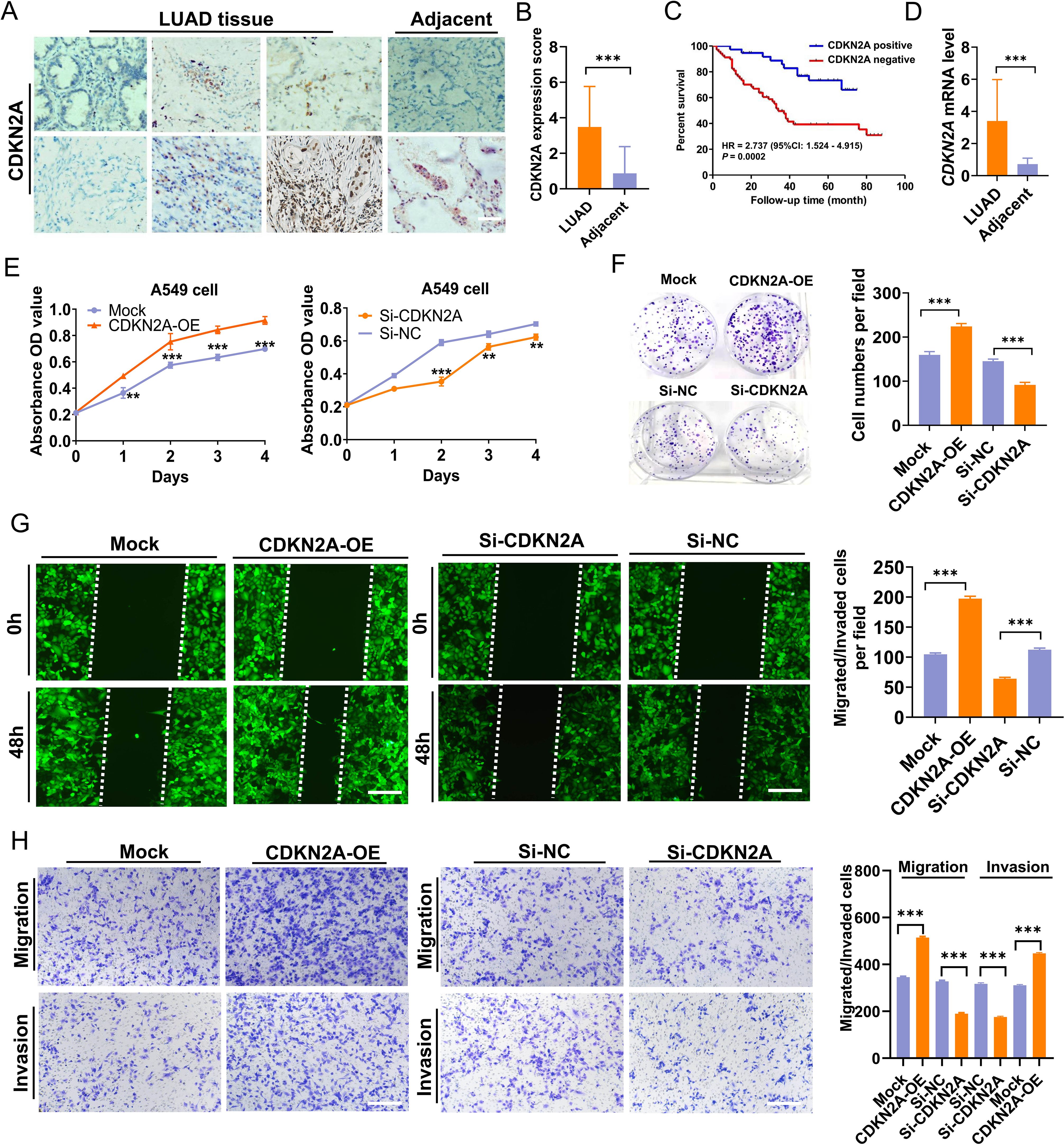 Figure 7. Elevation of CDKN2A expression in LUAD and its biological function in A549 cells. (A, B) CDKN2A expression levels were compared between LUAD and adjacent noncancer tissues [individual cohort form a tissue chip (Cat. No. HLugA180Su05), comprising 94 LUAD and 86 adjacent tissue spots; Shanghai Outdo Biotech, Shanghai, China]. (C) An inverse correlation was observed between increased CDKN2A expression and overall survival (OS) time. (D) Elevated CDKN2A mRNA levels in LUAD were validated using a cDNA chip (Cat. No. cDNA-HLugA030PG01, Shanghai Outdo Biotech, Shanghai, China; each tissue chip has 15 LUAD tissue points together with 15 adjacent normal tissue points). (E) CCK-8 assays were conducted to assess the viability of A549 cells with CDKN2A overexpression (CDKN2A-OE) or CDKN2A knockdown (Si-CDKN2A). (F) Colony formation ability was evaluated. (G, H) Migration and invasion capacities of A549 cells were assessed through Transwell and wound healing assays, employing stable transfections with CDKN2A-OE, Mock, Si-CDKN2A, and negative control siRNA (Si-NC) vectors. All data are presented as means ± SDs. Statistical analysis was performed using Student’s t-test or the Mann – Whitney test in (B, D–H); Kaplan–Meier analysis was used in (C). **P< 0.01, and ***P< 0.001.