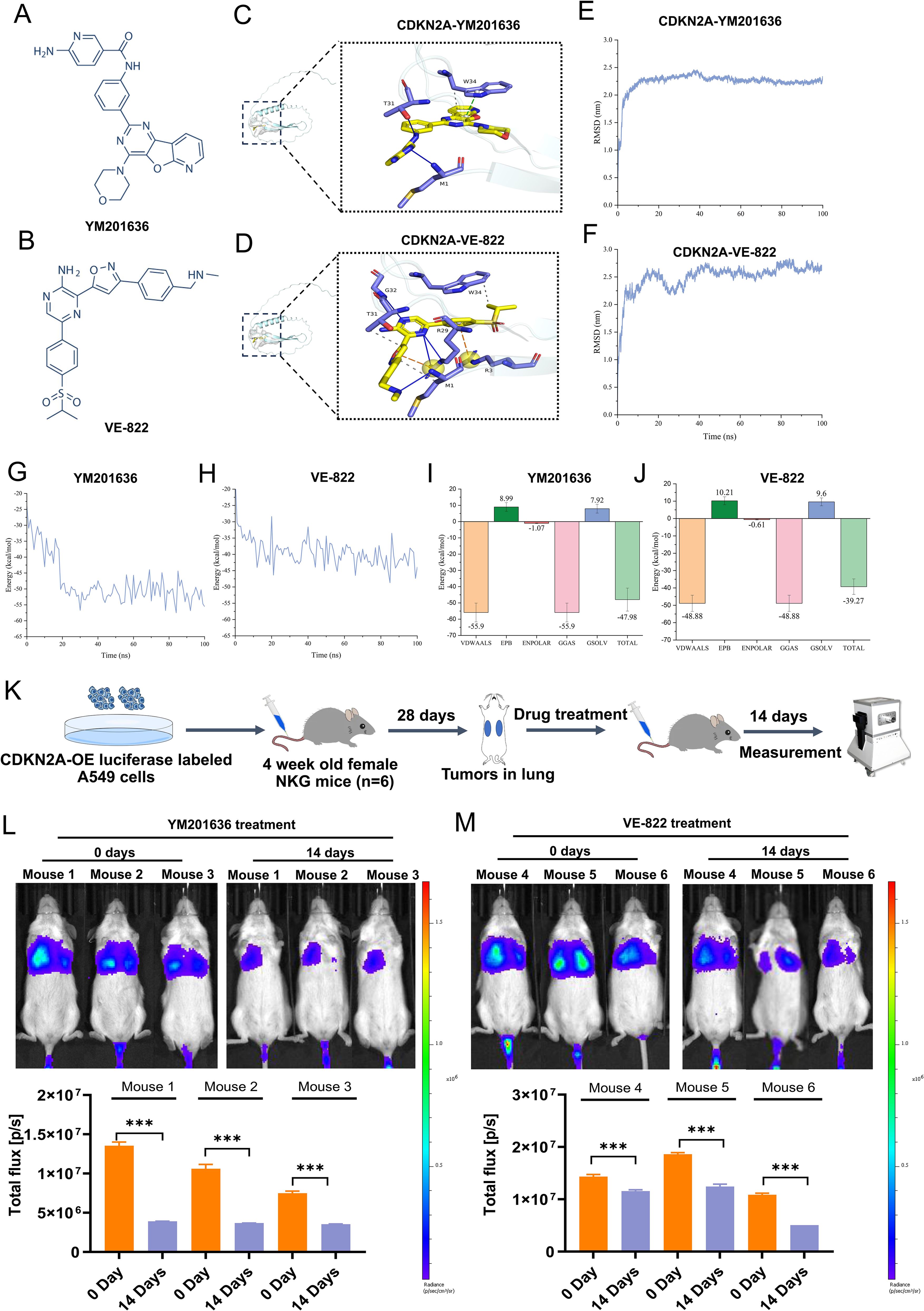 Figure 8. Screening of targeted drugs for CDKN2A through molecular docking and kinetic analysis, and their antitumor effects in vivo. (A, B) Structural formulas of the identified drugs YM-201636 and VE-822 are shown. (C, D) 3D diagrams depict the binding of YM-201636 and VE-822 to CDKN2A. (E, F) RMSD behavior of YM-201636 and VE-822 in molecular dynamics simulations is displayed. (G, H) The single-trajectory method was used to calculate the interaction energy of the protein–small-molecule drug complex. (I, J) The energy contributions of van der Waals (VDWAALS), electrostatic energy (EPB), polarization energy (ENPOLAR), gas phase energy (GGAS), and solvation energy (GSOLV) were calculated. (K) A schematic diagram illustrating the antitumor effects in vivo is presented. (L, M) Alterations in tumor fluorescence signal before and after treatment with YM-201636 or VE-822 are shown. All results are expressed as means ± SDs. Statistical analysis was performed using Student’s t-test or the Mann – Whitney test in (L, M). ***P< 0.001.