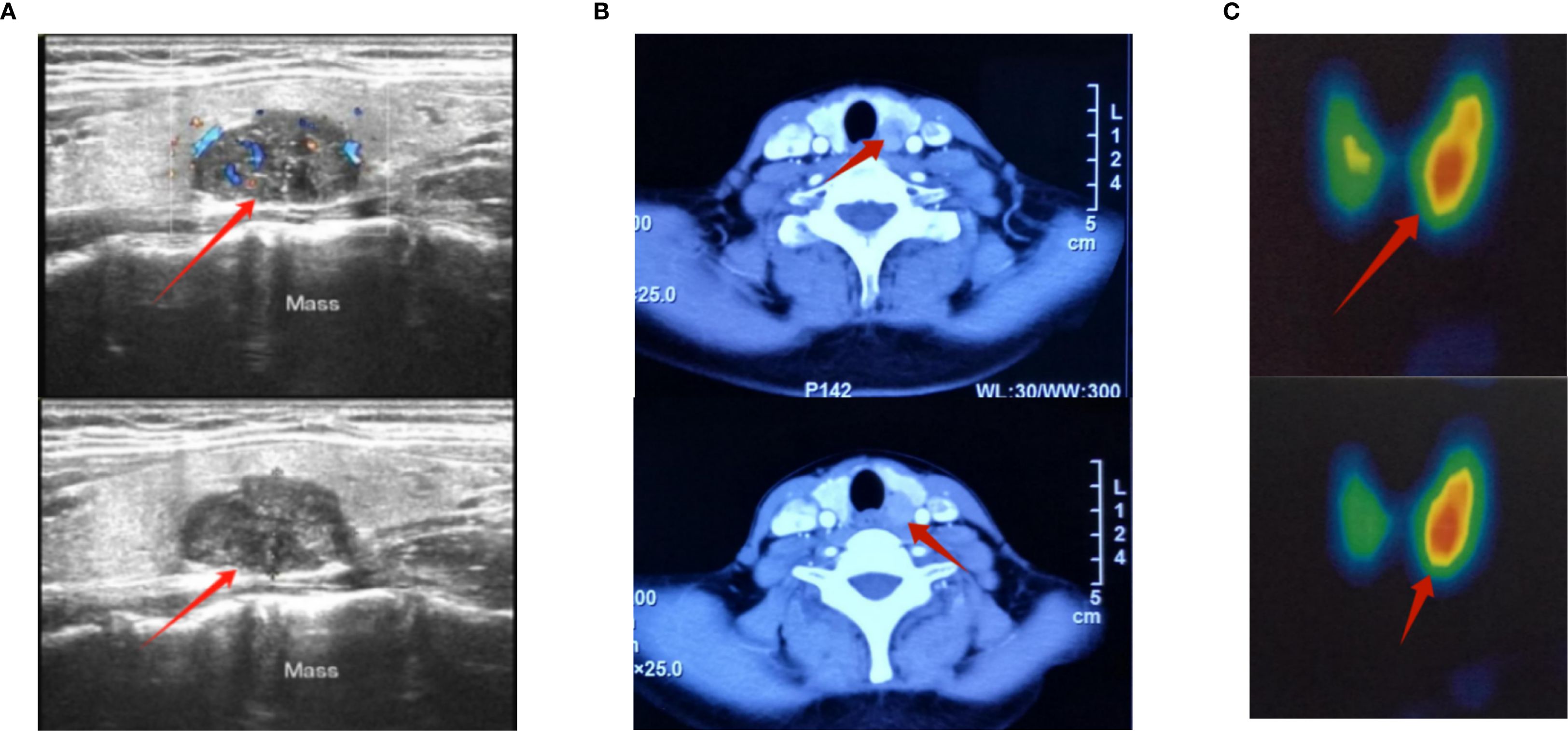 Figure 1. Preoperative color Doppler ultrasound, CT and 2.99mTc-MIBI images of the neck for parathyroid tumor. (A) Preoperative color Doppler ultrasound image of the parathyroid gland; the red arrow marks the location of the tumor. The diagnosis showed a solid mass in the left lobe of the thyroid gland, measuring 27×21×17 mm, of unknown nature. (B) Preoperative CT image of parathyroid gland, the red arrow marks the location of the tumor. The result showed a nodule in the inner and posterior part of the left thyroid lobe, measuring 14×13×17mm, which was considered to be an adenoma. (C) Conventional thyroid imaging before parathyroid surgery 2.99mTc-MIBI thyroid-parathyroid imaging showed: Parathyroid imaging (digital subtraction imaging) showed a radioactive distribution concentration focus in the area equivalent to the left lower parathyroid gland, with a size of about 1.5×2.0cm. There was no obvious abnormality in the position of the thyroid gland, which still maintained a “butterfly” shape. The bilateral lobes were not large in shape, and the radioactive distribution was uneven. The asymmetric uptake rate (%): right lobe = 0.4, left lobe = 0.6, total: 1.0. Area (Cm²): right lobe = 7.9, left lobe = 9.4, total: 17.3. Digital subtraction imaging showed the imaging findings of left lower parathyroid adenoma and hyperfunction; the red arrow marks the location of the tumor.