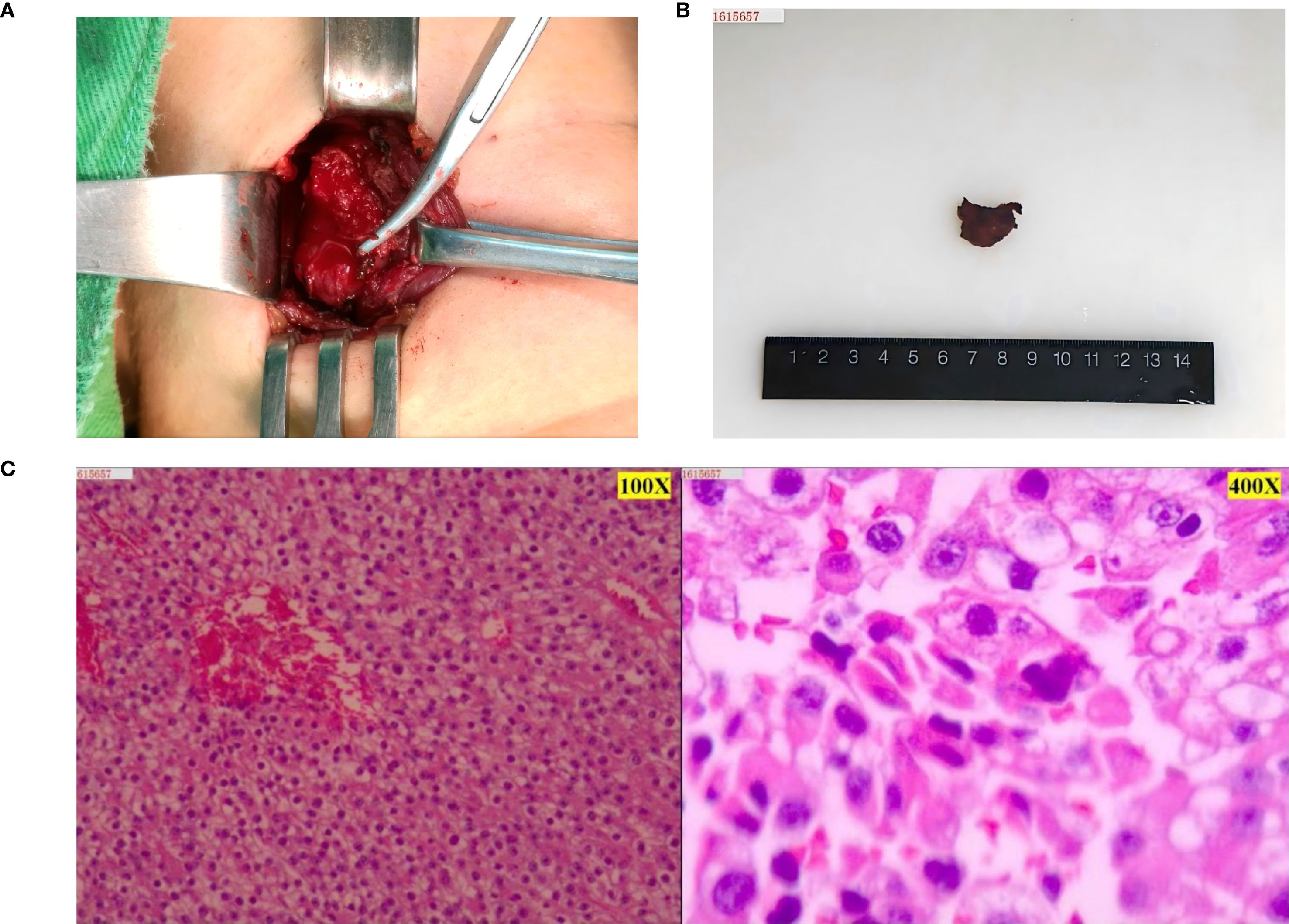 Figure 2. Intraoperative and postoperative tumor and postoperative pathological images of parathyroid tumor. (A) Parathyroid tumor seen during surgery. (B) Gross image of a parathyroid tumor removed surgically. (C) The first postoperative pathology showed an atypical parathyroid adenoma of the “left inferior parathyroid gland”, with focal extracapsular infiltration, and the possibility of malignancy could not be ruled out. Combined with the comprehensive clinical judgment, the current diagnosis was left inferior parathyroid adenocarcinoma (left side microscope was 100X, right side microscope was 400X). Immunohistochemistry results (positive and negative controls were set up): tumor cells: CgA (focal +); Sym (weak +); TTF1 (-); Ki-67 (about 15-20% +); CD34 (no vascular infiltration); Parafibromin (-).