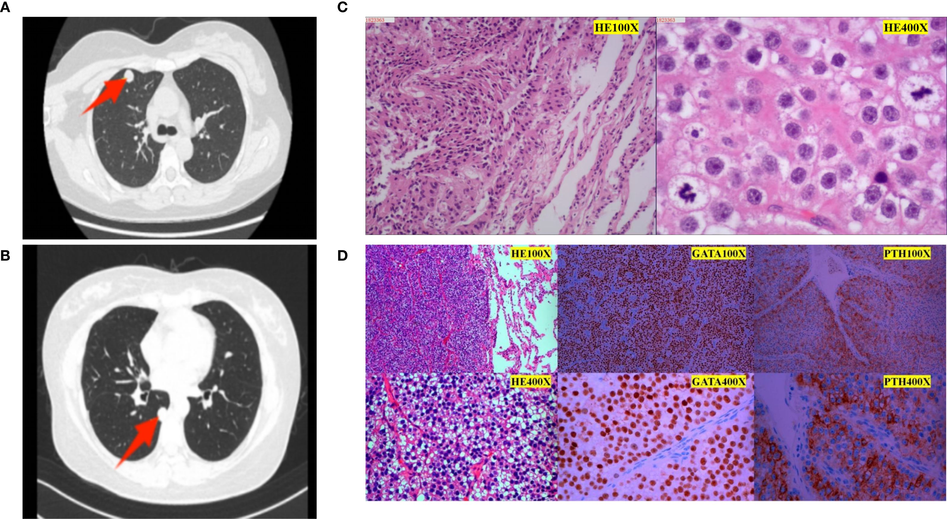 Figure 3. Imaging and pathological images of two pulmonary metastases. (A) Chest CT image before the first lung metastasis surgery. A nodule was seen in the anterior segment of the right upper lobe, measuring approximately 13 mm in diameter with smooth edges and obvious enhancement on enhanced scanning. The yellow arrow indicates the location of the tumor. (B) Chest CT image before the second lung metastasis surgery. A solid nodule was found under the pleura in the dorsal segment of the right lower lobe, approximately 15mmx12mm in size, the yellow arrow indicates the location of the tumor. (C) Pathology after the first lung metastasis surgery: The “right upper lung nodule” was suspected to be a metastatic parathyroid tumor(left side microscope was 100X, right side microscope was 400X). (D) Postoperative pathology of the second lung metastasis: The morphology of the “right lower lung dorsal segment and nodules” is considered to be a neuroendocrine tumor. Combined with immunohistochemistry and medical history, it is consistent with metastatic parathyroid tumor. Immunohistochemistry results (positive and negative controls were set up): tumor cell SSTR2 (scattered a little +), CgA (scattered a little +), SYN (scattered a little +), CD56 (-), CK-pan (+), Ki-67 (about 5% +), TTF1 (-), GATA-3 (+), Calcitonin (-), PTH (+).
