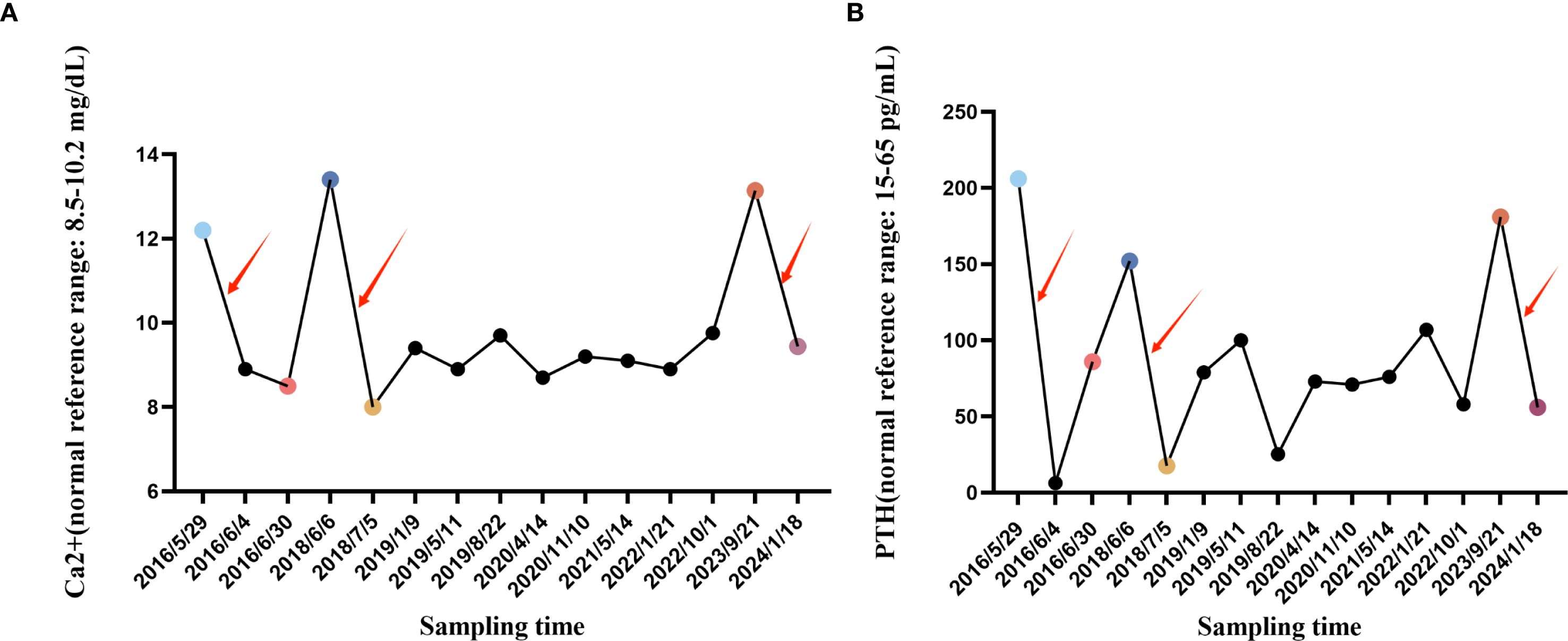 Figure 4. Line graph of changes in blood calcium and blood PTH. (A) The blood Ca2+ change curve during hospitalization and follow-up in our hospital from May 29, 2016 to January 18, 2024, where the specially marked points are the blood Ca2+ concentration before the first parathyroid cancer operation, the blood Ca2+ concentration after the first parathyroid cancer operation, the Ca2+ ion concentration before the first tumor lung metastasis, the blood Ca2+ concentration after the first tumor lung metastasis operation, the Ca2+ ion concentration before the second tumor lung metastasis, and the Ca2+ ion concentration after the second tumor lung metastasis operation. (B) The blood PTH change curve during hospitalization and follow-up in our hospital from May 29, 2016 to January 18, 2024, where the specially marked points are the first blood PTH concentration before parathyroid cancer surgery, the first blood PTH concentration after parathyroid cancer surgery, the first blood PTH concentration before tumor lung metastasis, the first blood PTH concentration after tumor lung metastasis surgery, the second blood PTH concentration before tumor lung metastasis, and the second blood PTH concentration after tumor lung metastasis surgery. The red arrows indicate the time periods of the three surgeries. (Ca2+: normal reference range: 8.5-10.2 mg/dL; 2.12-2.55 mmol/L) (PTH: normal reference range: 15-65 pg/mL; 1.6-6.9 pmol/L).