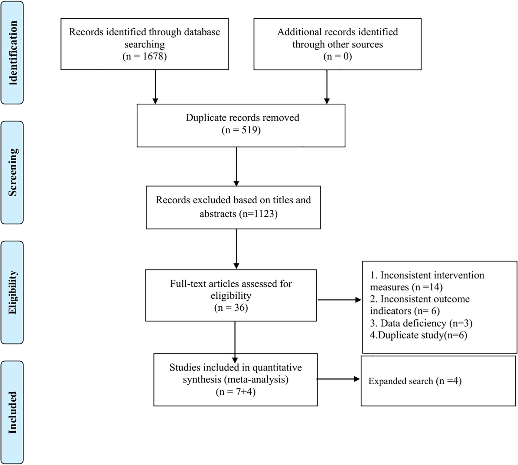 The literature search yielded 1678 results, most of which were excluded because they were replicates or because they were not relevant to our meta-analysis. Then, the full text of 36 articles is reviewed. Finally, 11 literatures were included in this study. See Figure 1. Flow chart.