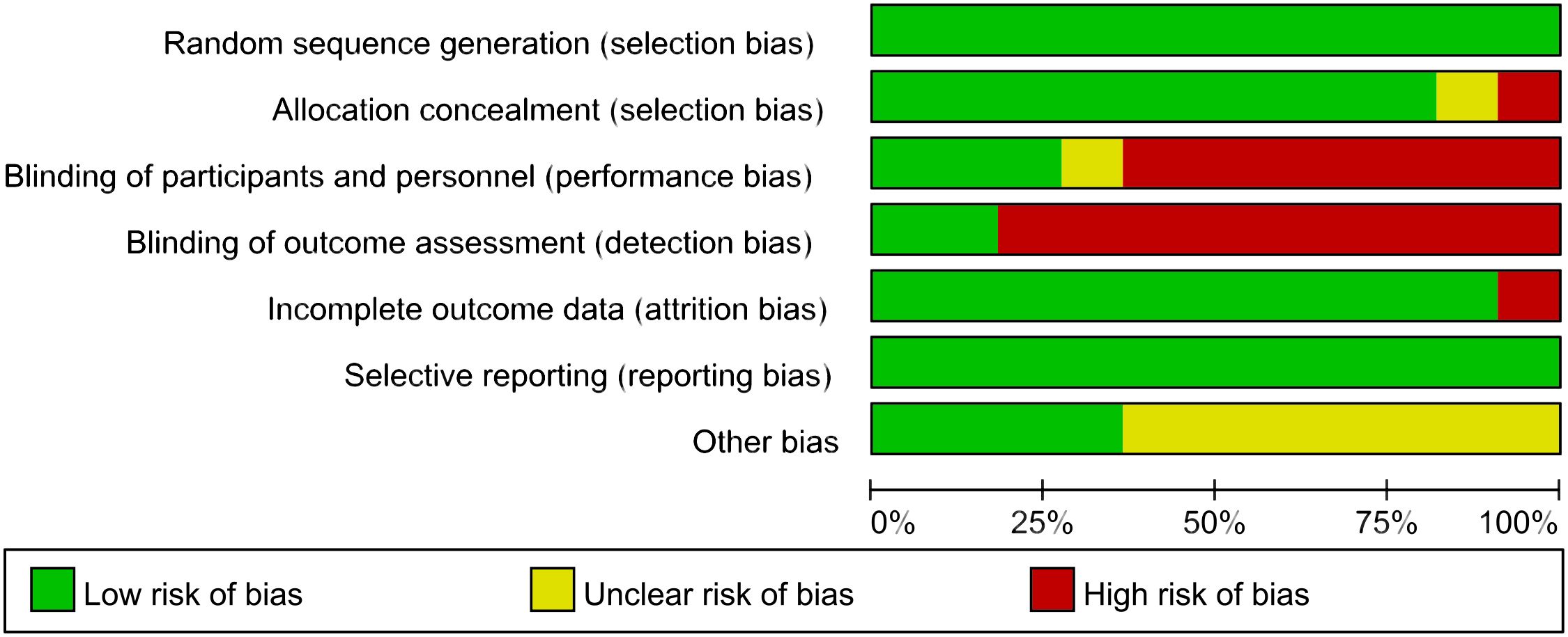 The authors independently assessed the risk of bias in included RCTS using the Cochrane assessment tool, which included the following seven areas: “adequate sequence generation, assignment concealment, participant and person blinding, outcome assessment blinding, incomplete outcome data, selective reporting, and other bias”.