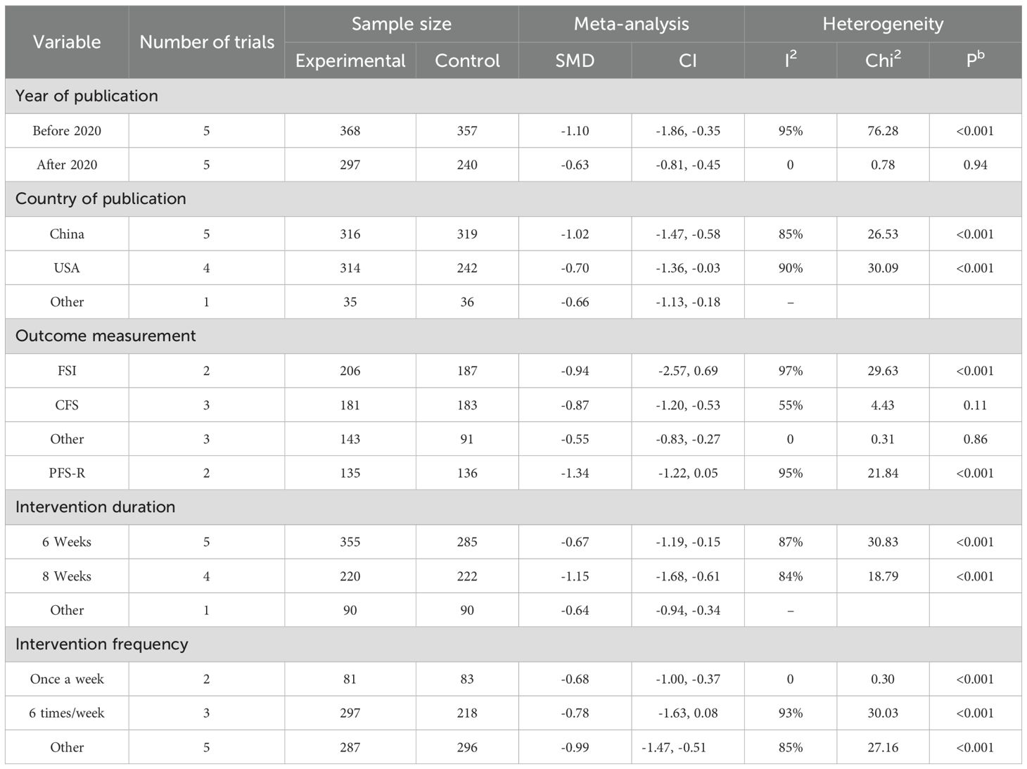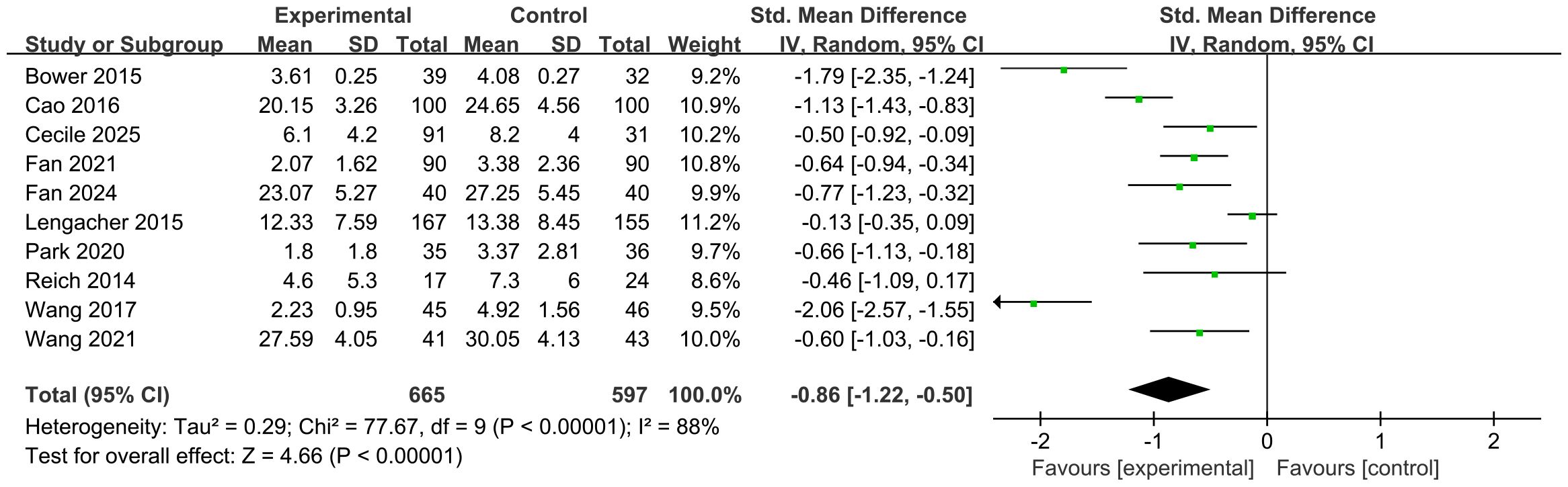 The efficacy of MBSR was compared with that of the control group. A meta-analysis of 10 studies was conducted, and the overall results are presented in Figure 3. Compared to the control group, MBSR significantly alleviated CRF [SMD = –0.86, 95% CI (–1.22, –0.50), p < 0.001], with significant heterogeneity observed (I² = 88%, p < 0.001). Sensitivity analysis was performed by sequentially excluding each study, yet substantial heterogeneity persisted. Therefore, subgroup analysis was conducted to explore potential sources of heterogeneity; detailed results are provided in Table 2 and the Supplementary Materials.