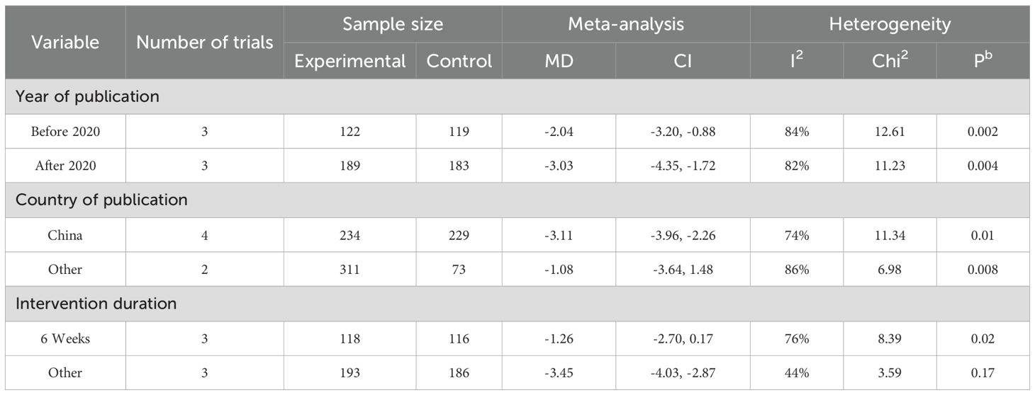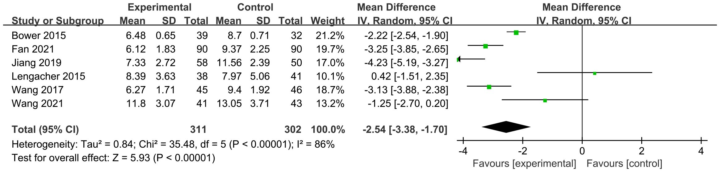 The efficacy of MBSR was compared with that of a control group. A meta-analysis of six studies was performed, and the overall findings are illustrated in Figure 4. Compared with the control group, MBSR resulted in a significant improvement in sleep quality among breast cancer patients [MD = –2.54, 95% CI (–3.38, –1.70), p < 0.001], with significant heterogeneity detected (I² = 86%, p < 0.001). Sensitivity analysis conducted by sequentially excluding individual studies showed that substantial heterogeneity remained. Therefore, subgroup analyses were carried out to explore potential sources of heterogeneity; detailed results are presented in Table 3 and the Supplementary Materials.