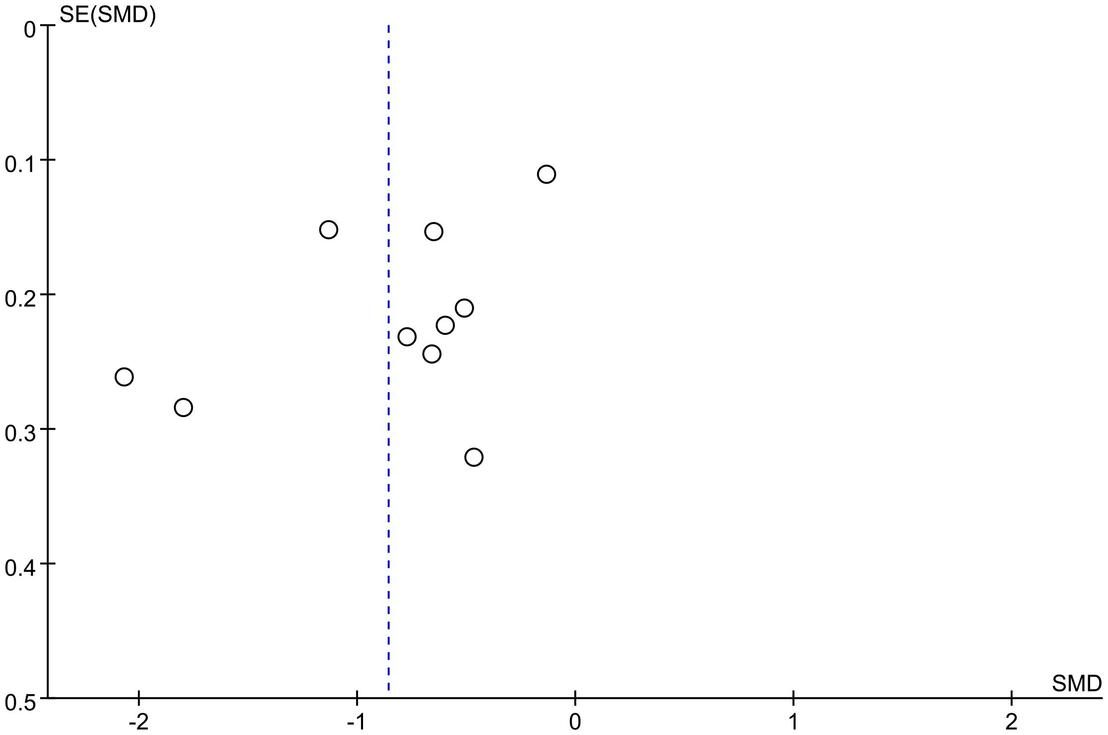 RevMan 5.3 software was used for analysis. If there was no statistical significance in the heterogeneity among the results (P≥ 0.1, I2 < 50%), a fixed effect model was used for meta-analysis. If the heterogeneity among the findings was statistically significant (P < 0.1, I2 ≥50%), the random-effects model was used for meta-analysis after the influence of apparent clinical heterogeneity was excluded. For continuous data, Weighted Mean Difference (WMD) was used to analyze results obtained with the same measurement tools. Standardized Mean Difference (SMD) was used to analyze the same variables when different measurement tools were used. 95%CI was calculated for all analyses.