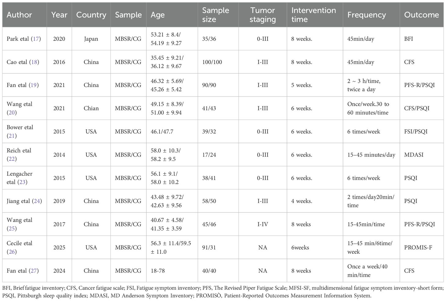 This meta-analysis followed the guidelines outlined in the systematic review and meta-analysis Preferred Reporting Program. Two independent researchers thoroughly searched multiple databases, including PubMed, Web of Science, Cochrane Library, CNKI, Wan Fang Data, and VIP. The search period was extended from the date of the establishment of the library until August 2025. Search is limited to articles published in Chinese or English. The search terms, including These searches, were performed using the following keywords: “Breast Neoplasm”, “Neoplasm, Breast,” “Breast Tumors”, “Breast Tumor”, “Tumor, Breast”, “Tumors, Breast”, “Neoplasms, Breast”, “Breast Cancer”, “Cancer, Breast”, “Mammary Cancer”, “Cancer Mammary”,”Cancers, Mammary”, “Mammary Cancers”, “Malignant Neoplasm of Breast”, “Breast Malignant Neoplasm”, “Breast Malignant Neoplasms”, “Malignant Tumor of Breast”, “Breast Malignant Tumor”, “Breast Malignant Tumors”, “Cancer of Breast”, “Cancer of the Breast”, “Fatigue”, “mindfulness-based stress reduction”, “mindfulness-based stress reduction”, “MBSR”, “mindfulness-based cognitive therapy”, “MBCT”, “mindfulness-based intervention”.