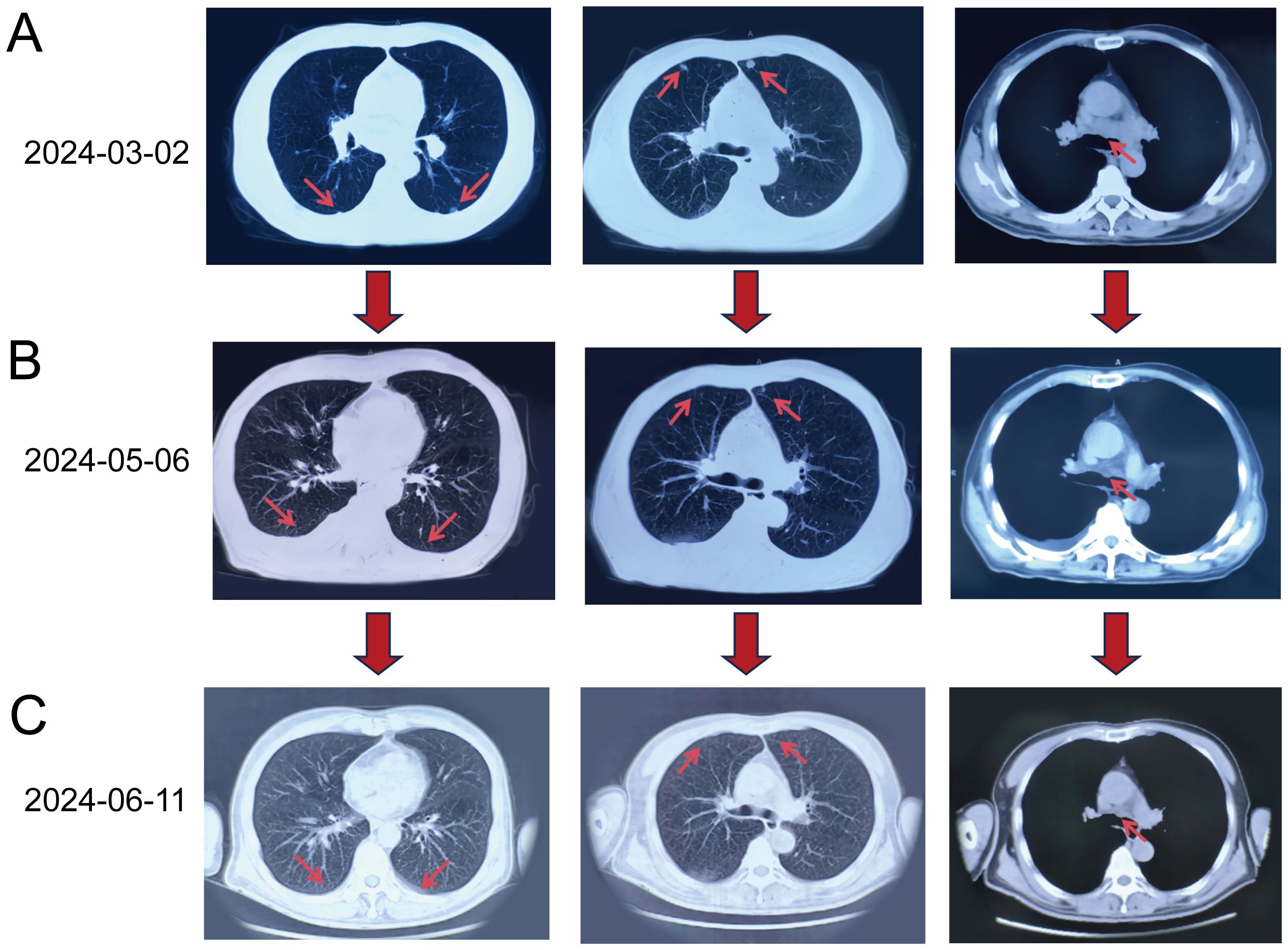 Figure 1. Chest CT scans obtained at different time points. (A) Baseline CT on March 2, 2024: Multiple nodular lesions (red arrows) in both lungs and enlarged mediastinal lymph nodes were visible. (B) Follow-up CT on May 6, 2024 (after four treatment cycles): Reduction in the size and number of pulmonary nodules (red arrows) and mediastinal lymph nodes (red arrow) was evident. (C) CT on June 11, 2024 (after six treatment cycles): Complete resolution of pulmonary nodules (red arrows) and further reduction in mediastinal lymph nodes (red arrow) were observed, indicating a complete response in the lungs.