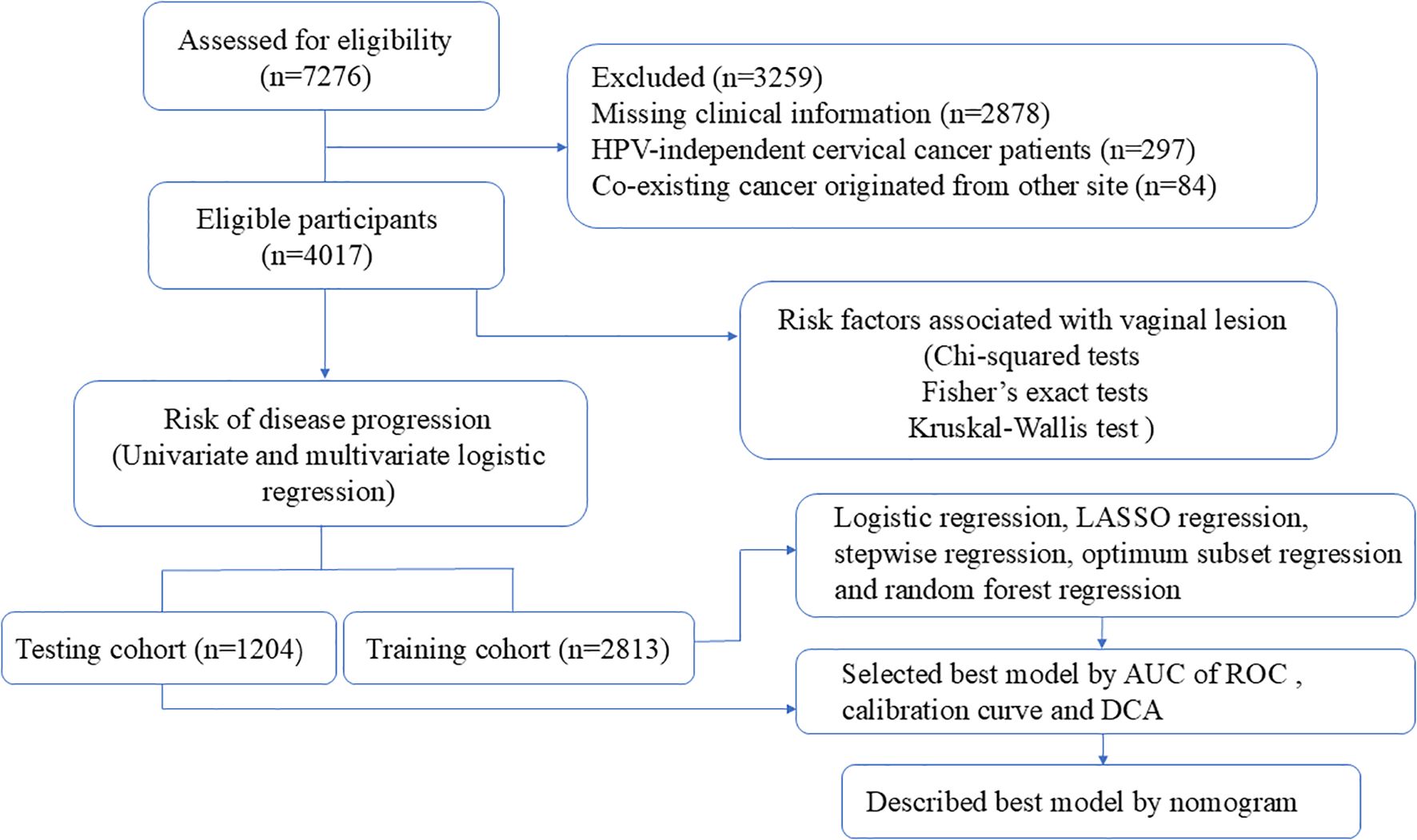 The cohort of 4017 patients were randomly divided into training and testing clusters (2813 and 1204 patients, respectively) using “caret” R package. To identify potentially significant factors affecting the risk of vaginal lesions, we performed univariate logistic regression analyses on the training cohort. Factors with p-values < 0.1 were considered candidates for inclusion in the multivariate models. Then, we employed multiple methods to construct risk scores in the training cohort, including Least Absolute Shrinkage and Selection Operator (LASSO) regression, stepwise regression, optimum subset regression, random forest regression, and logistic regression. Each method was chosen for its unique strengths in handling high-dimensional data, avoiding overfitting, and capturing complex interactions. The method that yielded the best AUC of ROC, the degree of agreement with the 45°curve of the calibration curves and decision curve analysis (DCA) in the testing cohort, was selected as optional for vaginal lesion risk prediction. After that, a nomogram was established based on a new model to present the probability of vaginal lesions in future cases.