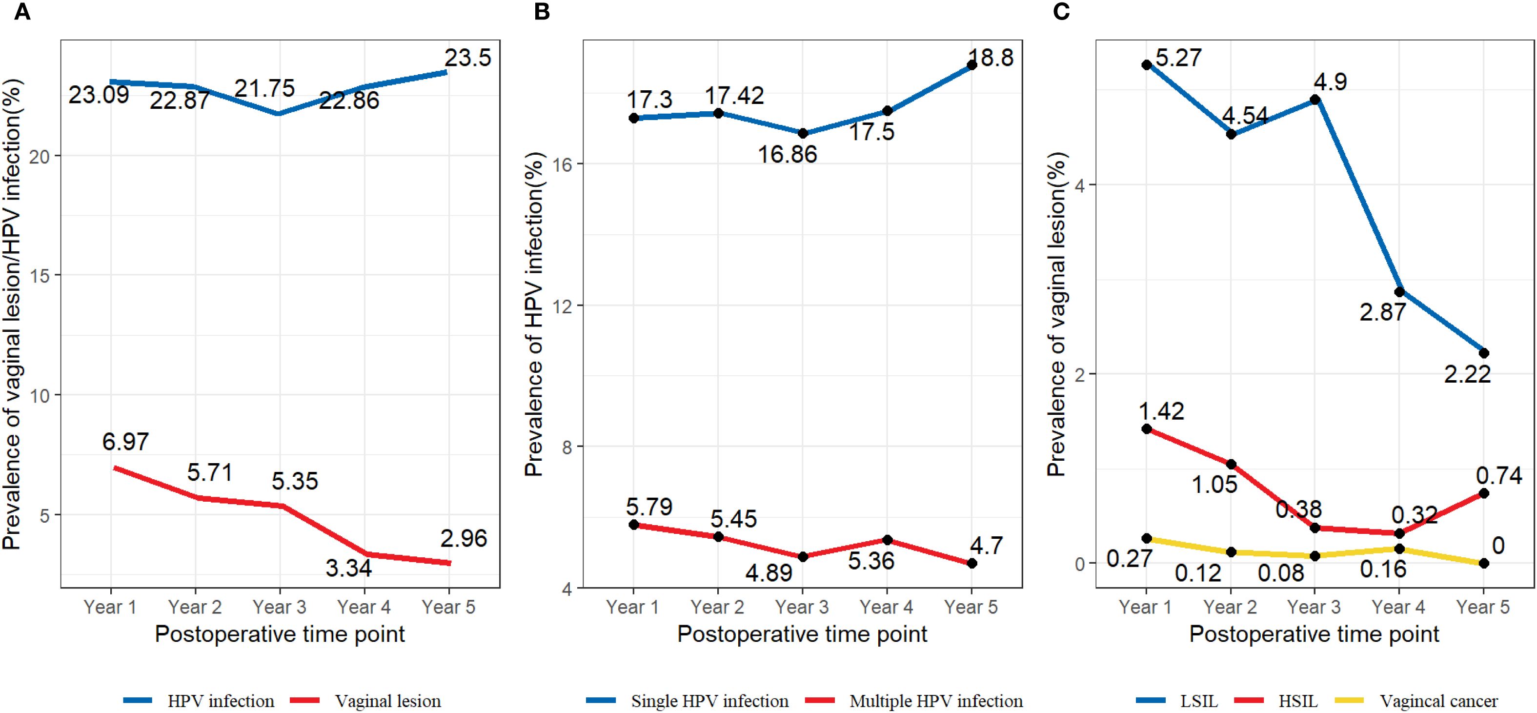 Figure 6. (A) HPV infection rate and the incidence of vaginal lesions within five years post-operation (B) Single HPV infection rate and multiple HPV infection rate within five years post-operation (C) The incidence of LSIL, HSIL, and vaginal cancer within five years post-operation.