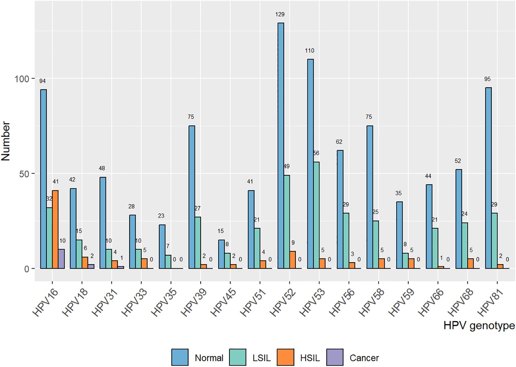 Figure 3. Association of HPV genotype and vaginal disease progression in the patient cohort with a single HPV infection.