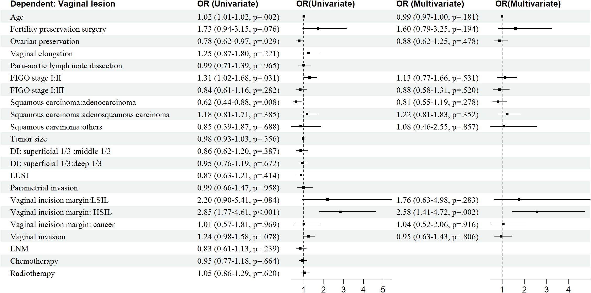 Age, OP, FIGO stage, histological type, vaginal incision margin, and HPV infection were found to significantly influence the incidence of sequela vaginal lesion (P<0.05), as shown in Table 1. As can be seen in Figure 4, patients who were older (OR = 1.02, 95% CI: 1.01–1.02) or at stage II (OR = 1.31, 95% CI: 1.02–1.68) were more susceptible to developing vaginal lesions. OP during surgery (OR = 0.78, 95% CI: 0.62–0.97) and histology as adenocarcinoma (OR = 0.62, 95% CI: 0.44–0.88) seemed to be protective from further vaginal lesions. As for vaginal incision margin, compared with a negative margin, both LSIL status (OR = 2.20, 95% CI: 0.90–5.41) and HSIL status (OR = 2.85, 95% CI: 1.77–4.61) were remarkably related to vaginal lesions. However, an incision margin with cancer (OR = 1.01, 95% CI: 0.57–1.81) was insignificantly related to vaginal lesions.