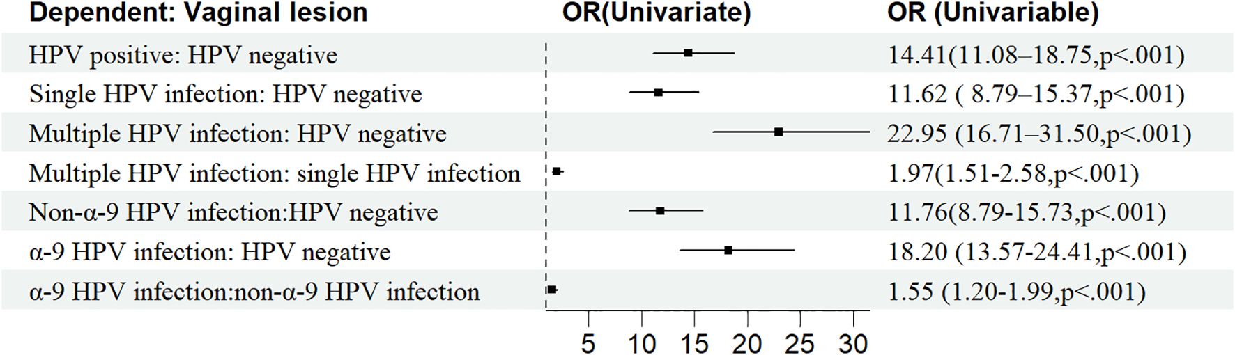 Further multivariate logistic analysis showed HSIL incision margin (OR = 2.58, 95% CI: 1.41–4.72), single non-α-9 HPV infection (OR = 11. 08, 95% CI: 8.17–15.02), single α-9 HPV infection (OR = 12. 58, 95% CI: 8.79–18.00), multiple HPV infection without α-9 HPV (OR = 16.30, 95% CI: 9.91–26.81), and multiple HPV infection with α-9 HPV (OR = 26.50, 95% CI: 18.66–37.65) remained remarkably associated with vaginal lesions (P<0.05). As multiple HPV infection was significantly associated with α-9 HPV infection, patients with α-9 HPV infection were more prone to get multiple HPV infections (OR = 1.55, 95% CI: 1.20–1.99); these factors were unified as HPV-infection.
