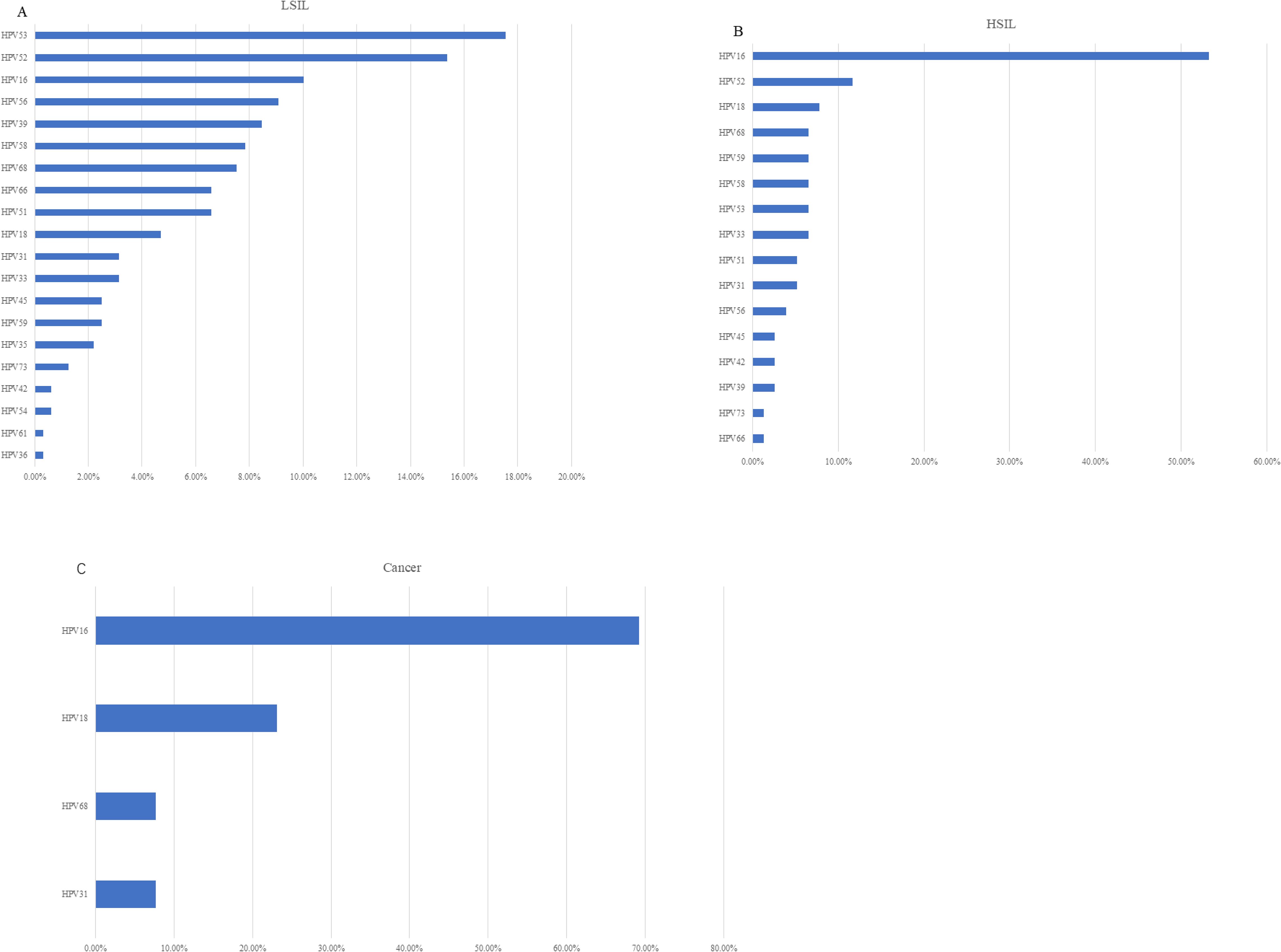 Figure 2. (A) Prevalence of specific HPV genotypes among the vaginal LSIL population. (B) Prevalence of specific HPV genotypes among the vaginal HSIL population. (C) Prevalence of specific HPV genotypes among the vaginal cancer population.