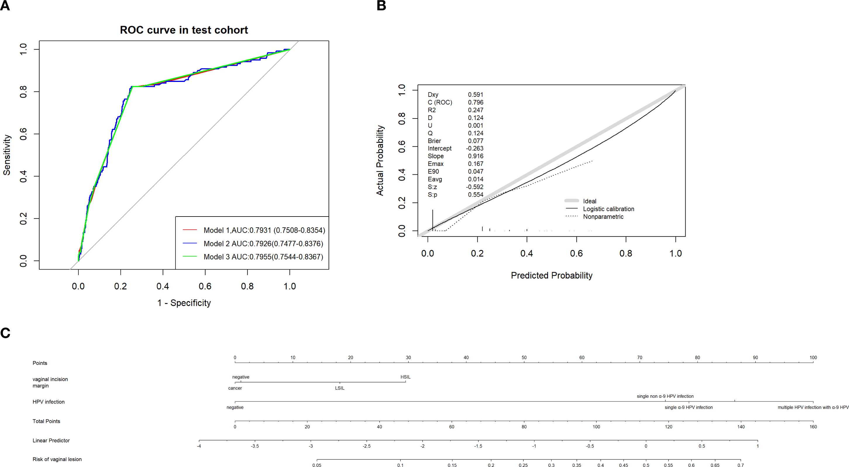 Figure 7. (A) ROC of different predictive models established in predicting vaginal lesions and AUC were compared. (B) Calibration curves of predictive models above. (C) Nomogram of predicting vaginal lesion with factors from multivariate analysis respectively.
