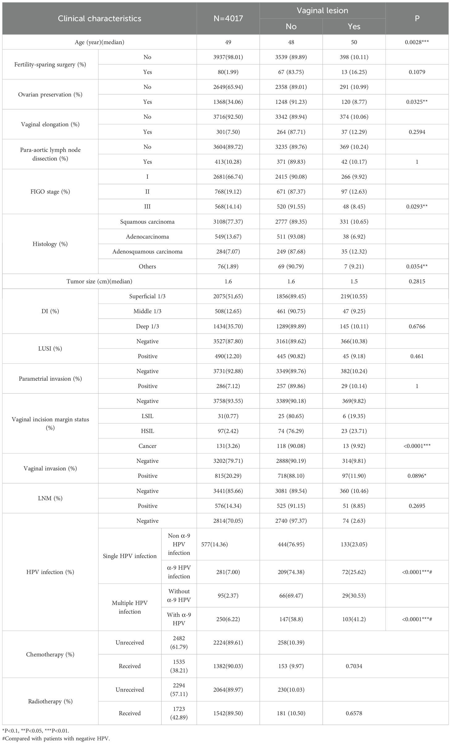 Continuous variables (age and tumor size) were found to be abnormally distributed, thus a Kruskal-Wallis test was used to analyze these variables. A chi-squared test and Fisher’s exact test were applied for categorical variables. Baseline results that (shown in Table 1) were generated using R package “tableone”. Univariate and multivariate logistic regression estimated the odds ratio (OR) and 95% confidence interval (CI) to analyze the risk factors for postoperative vaginal lesions. The collinearity between multiple genotype HPV infection and α-9 HPV (including HPV 16, 31, 33, 35, 52, 58, 67) infection, multiple HPV infection and vaginal lesion, and α-9 HPV infection and vaginal lesion were calculated by R package “autoReg”.