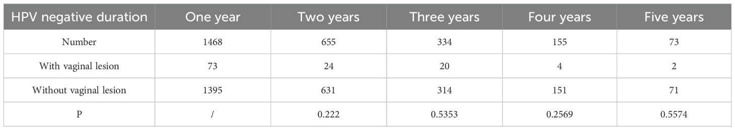 For the HPV kit, sensitivity of the test was 104 copies/mL (20 copies/reaction), for which low titration of HPV infection is presented as negative. To continuously observe the status of patients with HPV turning negative, patients with HPV normalized in the first year were followed up for the next five years after major surgery (Table 2). Patients with HPV that turned negative after the first year had a 50% risk of turning back positive each year, till only 73 patients were found to be negative for five years in a row. Of these patients, two were found with LSIL at Y3. Analysis of this population revealed that there is no significant difference in their risk of getting vaginal lesions as to the length of negative HPV duration (P>0.01).