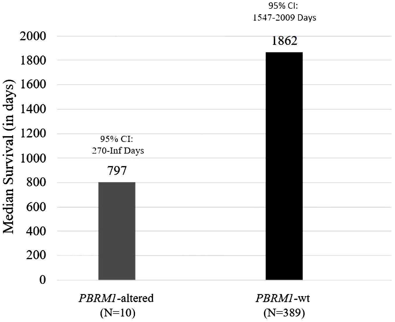 Genomics data from patient tumors that were sent to Caris Life Sciences for next-generation sequencing were utilized for this analysis. A total of 399 patients with meningiomas were identified, and 2.5% (n = 10) had alterations in PBRM1. Of the 10 patients with PBRM1 alterations, one patient had a known pathogenic point mutation variant (R1027X). Overall survival (OS) was estimated using the Kaplan–Meier method. The median OS was 797 days (95% CI 270 to ∞ days) for patients with PBRM1 alteration and 1,862 days for those without (95% CI 1,547–2,009 days) (Figure 1). Of note, the patient having the PBRM1 R1027X mutation had a survival of 797 days. The Kaplan–Meier plots and p-values were not generated due to a low sample size of PBRM1 alterations.
