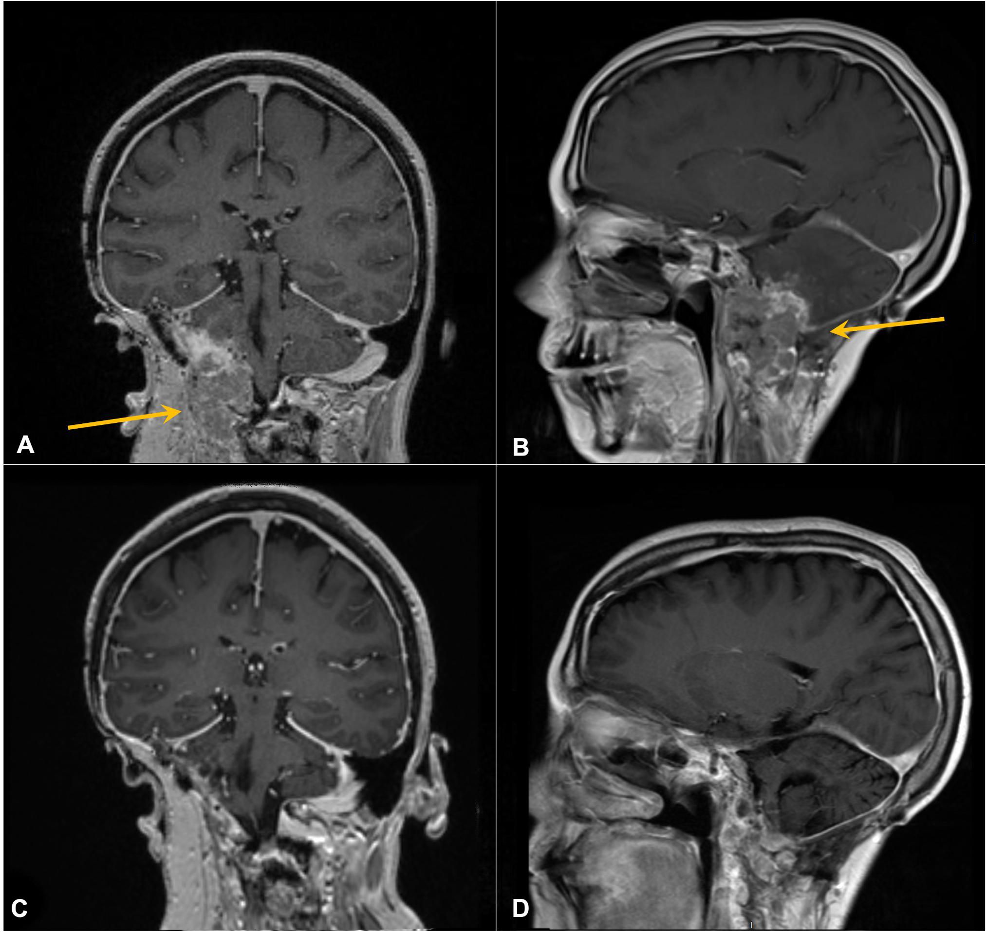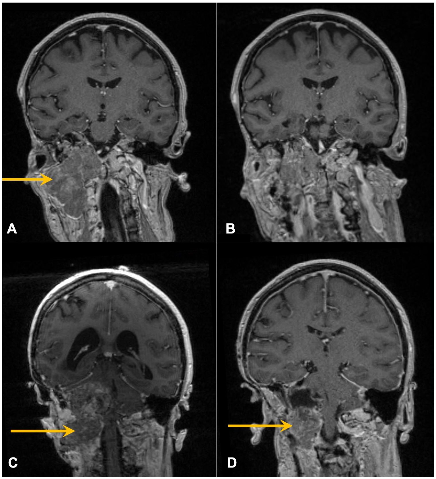 Figure 2. Contrast-enhanced coronal T1 MRI of the brain following recent surgeries. Arrows mark enhancing skull base mass prior to R1 (A) and R2 (C) and resulting post-operative images following R1 (B) and R2 (D).