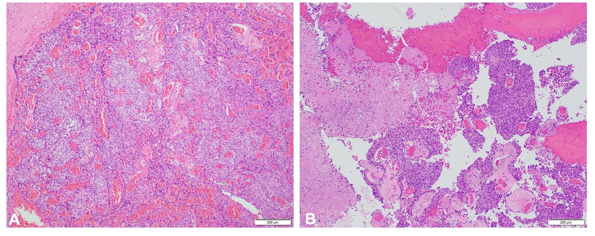 After recovery (June 2019), she enrolled in a phase I clinical trial of BXQ-350, a synthetic form of the human glycoprotein saposin C (NCT02859857). Unfortunately, she soon progressed in August 2019 with the growth of the right skull base tumor and began to have increased symptoms of headaches, dysphagia with liquids, and weight loss. To identify possible targeted therapies, next-generation sequencing (NGS) testing was performed on the R2 specimen (right cerebellar tumor) with FoundationOne. This demonstrated a non-elevated tumor mutational burden (TMB) of 4 Muts/Mb, stable microsatellite status, and no recommended therapies or trials. There were alterations including FBXW7 G419, BAP1 loss, and PBRM1 loss of exons 2 to 12. The tumor was also found to have a PD-L1 tumor proportion score of <1% on PD-L1 22C3 IHC testing.