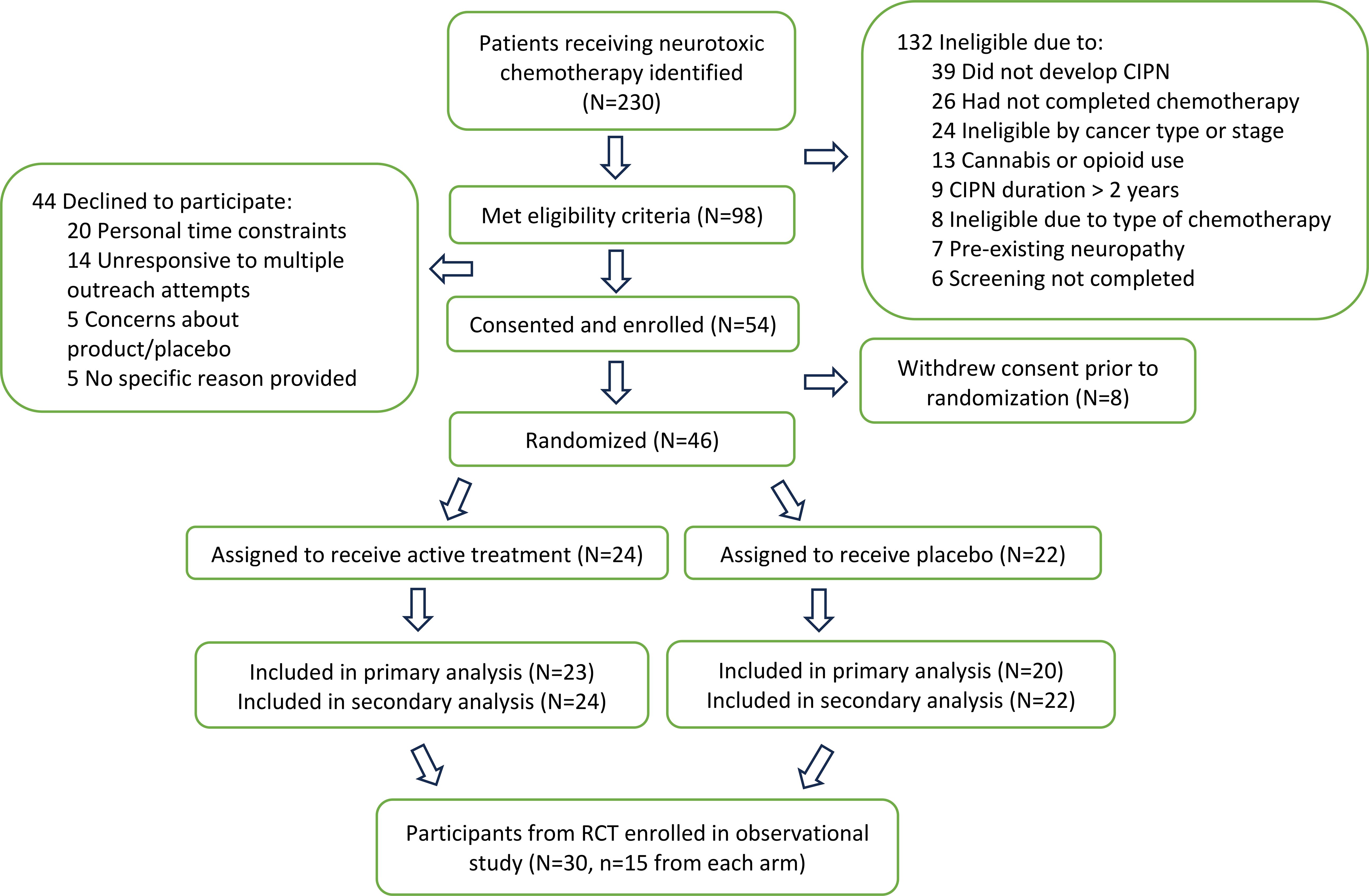 Materials and methods: This 12-week randomized, double-blind, placebo-controlled trial included participants with nonmetastatic breast, colorectal, endometrial, or ovarian cancer experiencing grade 2–3 CIPN. The active group received CBD (125.3-135.9 mg) combined with THC (6.0-10.8 mg) in gelcaps. The Quality-of-Life Questionnaire-CIPN twenty-item scale (QLQ-CIPN20) sensory subscale was used as the primary outcome. Additional outcomes assessed pain, sleep, and function. Neurologic exams evaluated touch, pressure, and vibration sense. Following the randomized controlled trial, participants were invited to enroll in a 12-week open-label observational study.