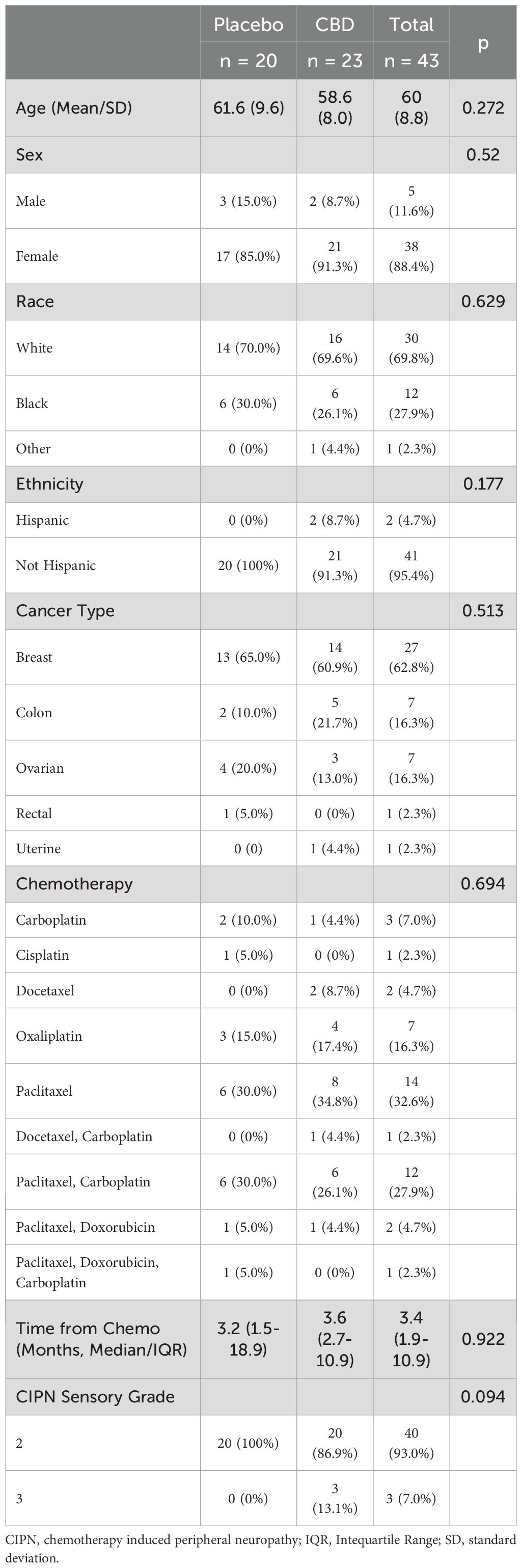 Of 230 potential participants, 124 met eligibility criteria and 54 were consented and enrolled. Of these, 46 were randomized and 43 completed 12 weeks (23 assigned to the active group, 20 to placebo) as shown in Figure 1. Demographic information and participant characteristics are shown in Table 1 for those who completed 12 weeks. The median time from chemotherapy (in months) was 3.2 (IQR 1.5-18.9) for the placebo group and 3.6 (IQR 2.7-10.9) for the CBD group. No between-group differences were seen.
