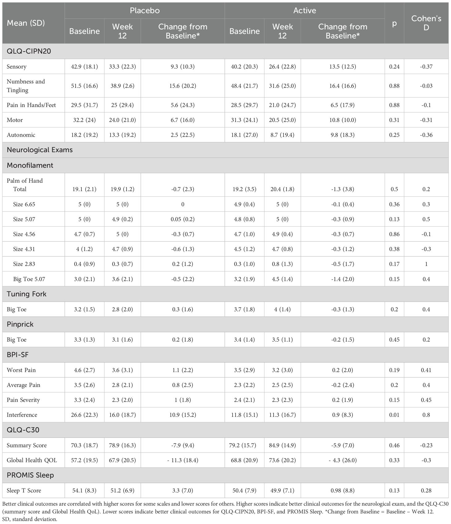 The primary data analysis investigated the change from baseline to week 12 and included only participants with complete data (n=20 placebo, n=23 active). The primary outcome was change in the QLQ-CIPN20 sensory subscore and secondary outcomes were change in numbness and tingling (from the QLQ-CIPN20), pain (from the QLQ-CIPN20), other QLQ-CIPN20 sub-scores (motor, autonomic), neurological exams, BPI, QLQ-30, and PROMIS from baseline to week 12. The mean differences from baseline and week 12 were compared between each arm with a two-sample t-test and Cohen’s d for effect size. Multiple imputation was not performed for the primary analysis, as applying it in a small sample could increase the risk of bias.
