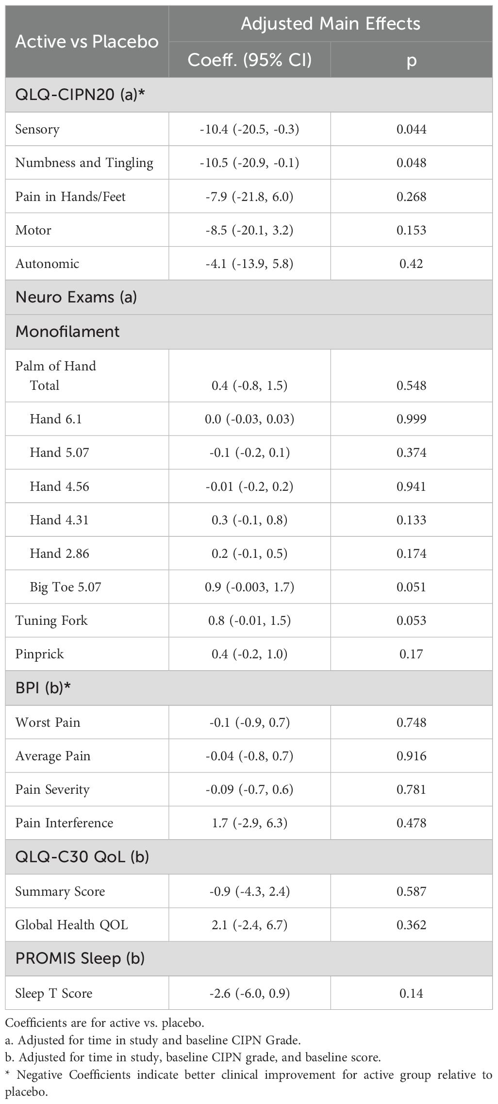 The secondary analysis included 46 participants who completed at least 8 weeks (see Supplementary Material for demographic information). The results are shown in Table 3. Here, greater improvement was seen in the active group in the sensory score of the QLQ-CIPN20 relative to the placebo group (-10.4 (95% CI -20.5, -0.3), p = 0.044). Additionally, the active group reported greater improvement in numbness and tingling compared to the placebo group (-10.5 (95% CI -20.9, -0.1), p = 0.048) with no difference in pain. No differences were seen in motor or autonomic symptoms. There were no differences in BPI-SF, QLQ-C30, or PROMIS scores. No adjustments were made for multiple comparisons in secondary analyses; as such, these findings should be considered hypothesis-generating and interpreted with caution.