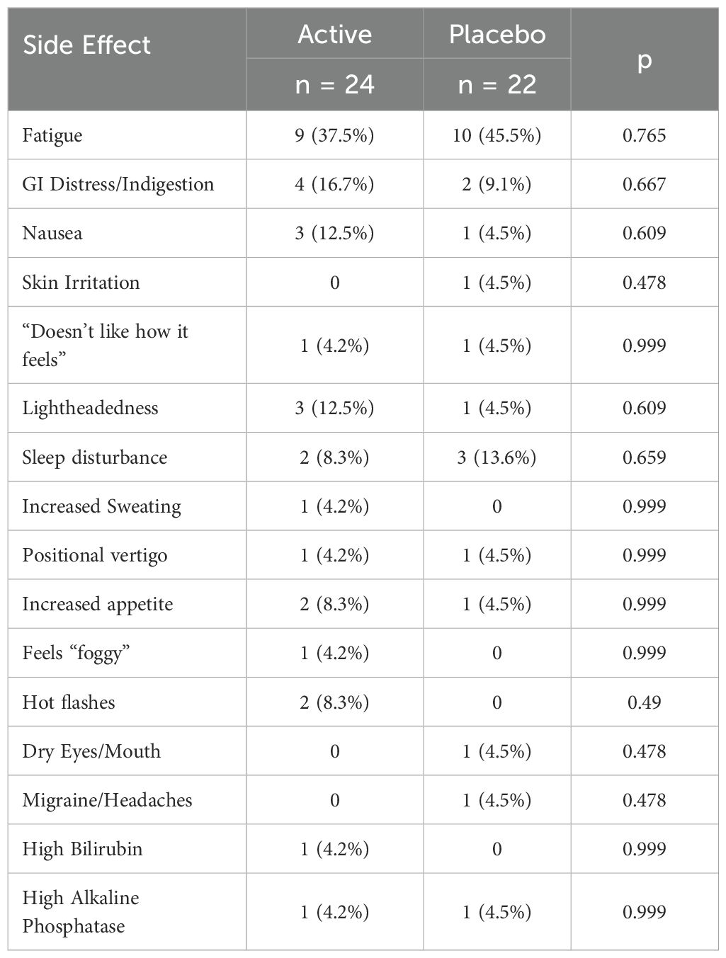 The side effects reported by participants are shown in Table 4. No between-group differences were seen. There were no serious adverse events, and no participant was removed from the study due to an adverse event. Please see Supplementary Material for side effects categorized by severity using CTCAE criteria (Supplementary Tables S2, S3). As shown in these tables, fatigue, gastrointestinal distress, and sleep disturbance were the most common side effects. The majority of side effects were rated as grade 2 (moderate symptoms).