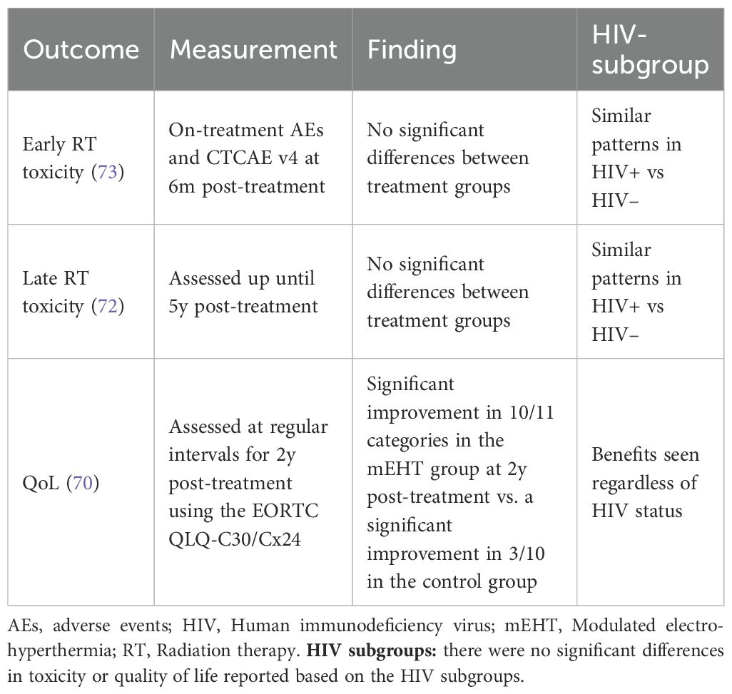 73. Minnaar CA, Kotzen JA, Naidoo T, Tunmer M, Sharma V, Vangu MDT, et al. Analysis of the effects of mEHT on the treatment-related toxicity and quality of life of HIV-positive cervical cancer patients. Int J Hyperthermia. (2020) 37:263–72. doi: 10.1080/02656736.2020.1737253